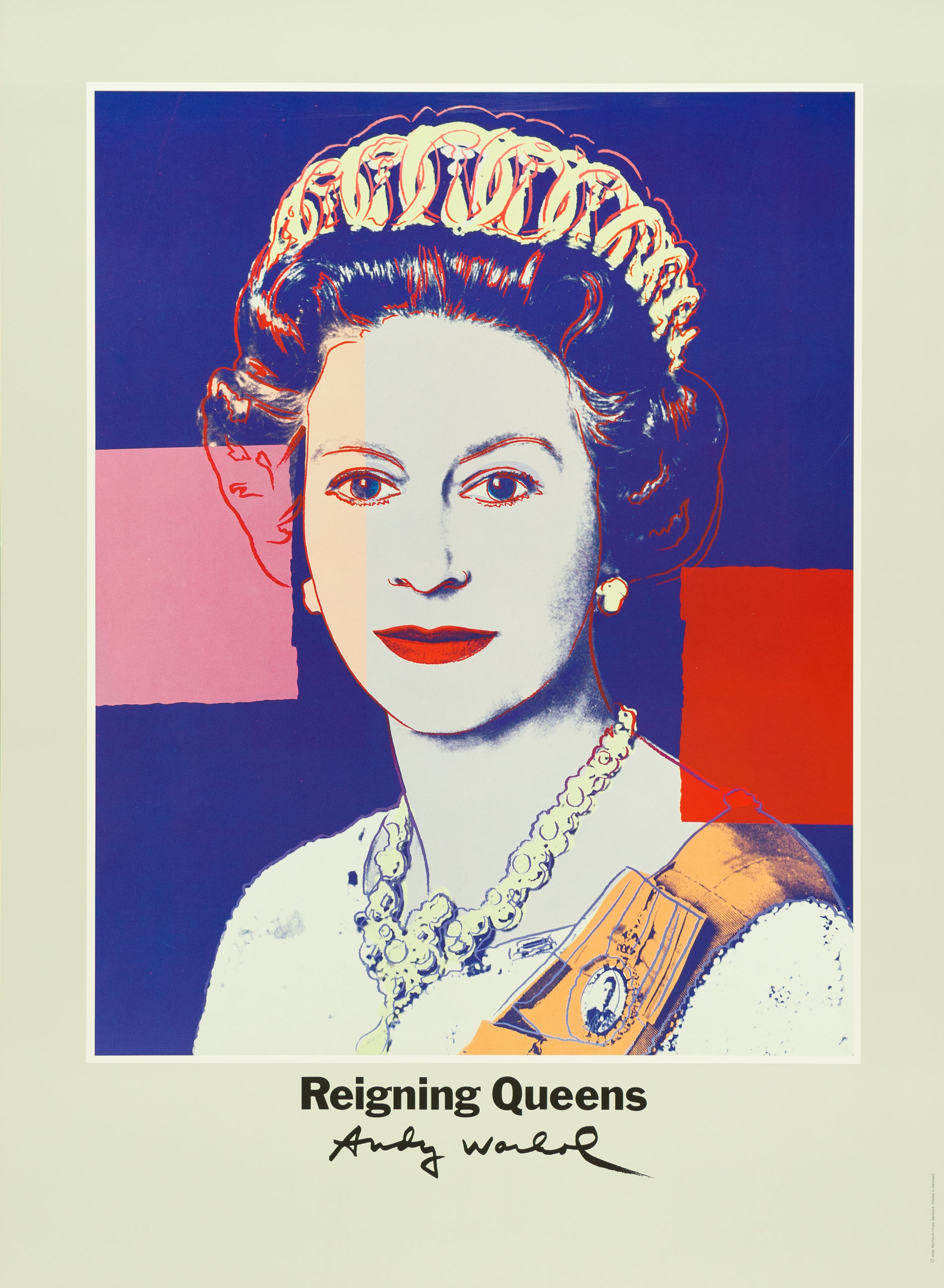 El proyecto Reinas reinantes (1985) tuvo como protagonistas a cuatro mujeres: Isabel II del Reino Unido, Beatriz de Holanda, Margarita II de Dinamarca y Ntombi Twala de Suazilandia. La serie consta de una primera tanda de 16 retratos serigrafiados, cuatro por cada reina, de los que Warhol hizo unas 40 copias. Los retratos fueron tomados de fotografías oficiales de las reinas o de representaciones que se producían en Exposición realizada en colaboración con el Museum für Kunst und Gewerbe de Hamburgo masa como sellos y monedas. | Reinas reinantes: Isabel II del Reino Unido. Cartel con motivo de Art Expo Dinamarca. Impresión offset, 1985. Cartel.