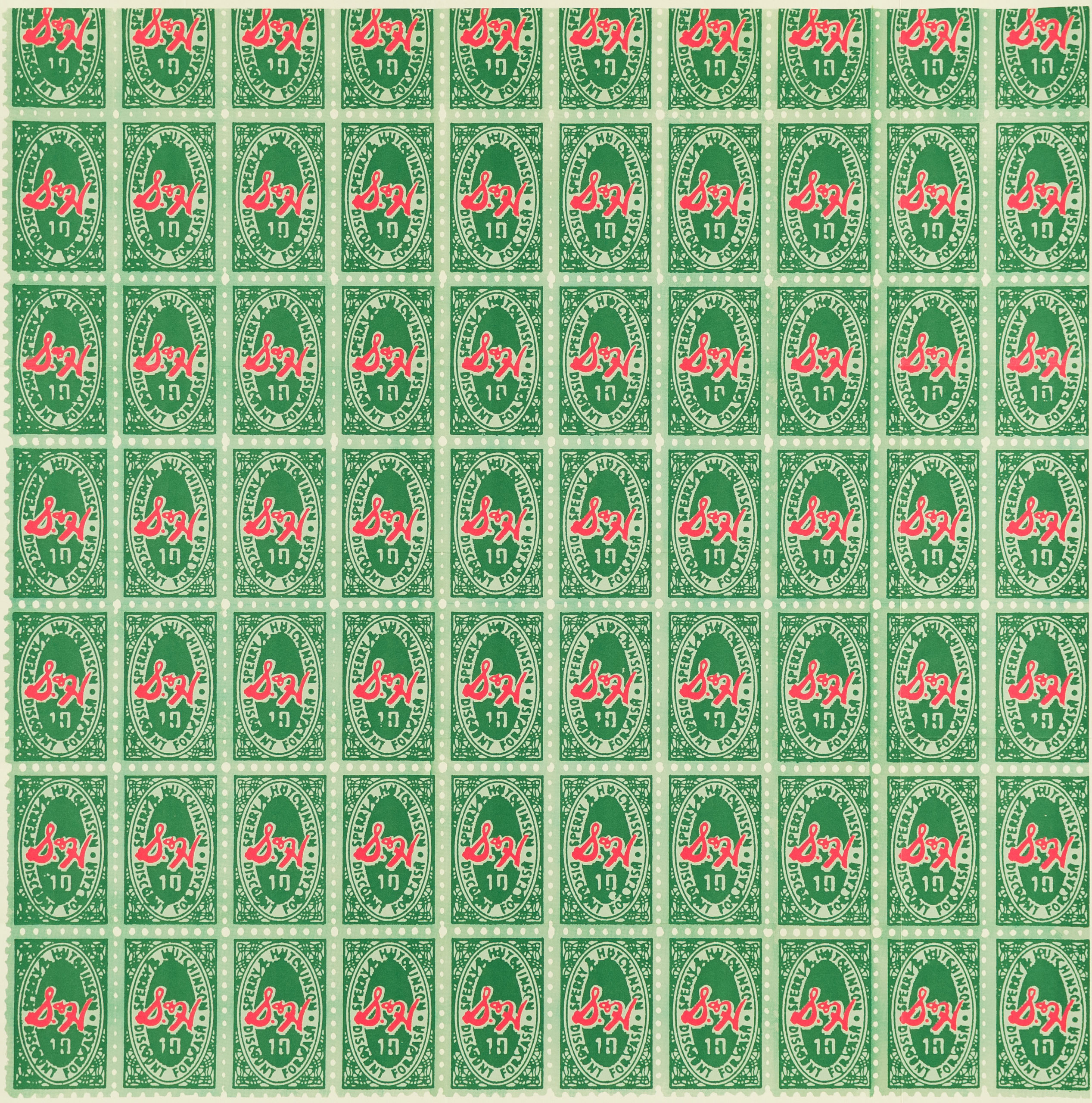 La imagen Sellos verdes S&H está compuesta por cupones de la empresa de venta por correo Sperry & Hutchinson, que tuvieron una amplia distribución en Estados Unidos hasta la década de 1980. El uso de moldes de caucho estampados una y otra vez sobre el lienzo realza ese proceso de repetición que buscaba Warhol. | Sellos verdes S&H. Exposición en Instituto de Arte Contemporáneo de Filadelfia. Impresión offset, 1965. Cartel.