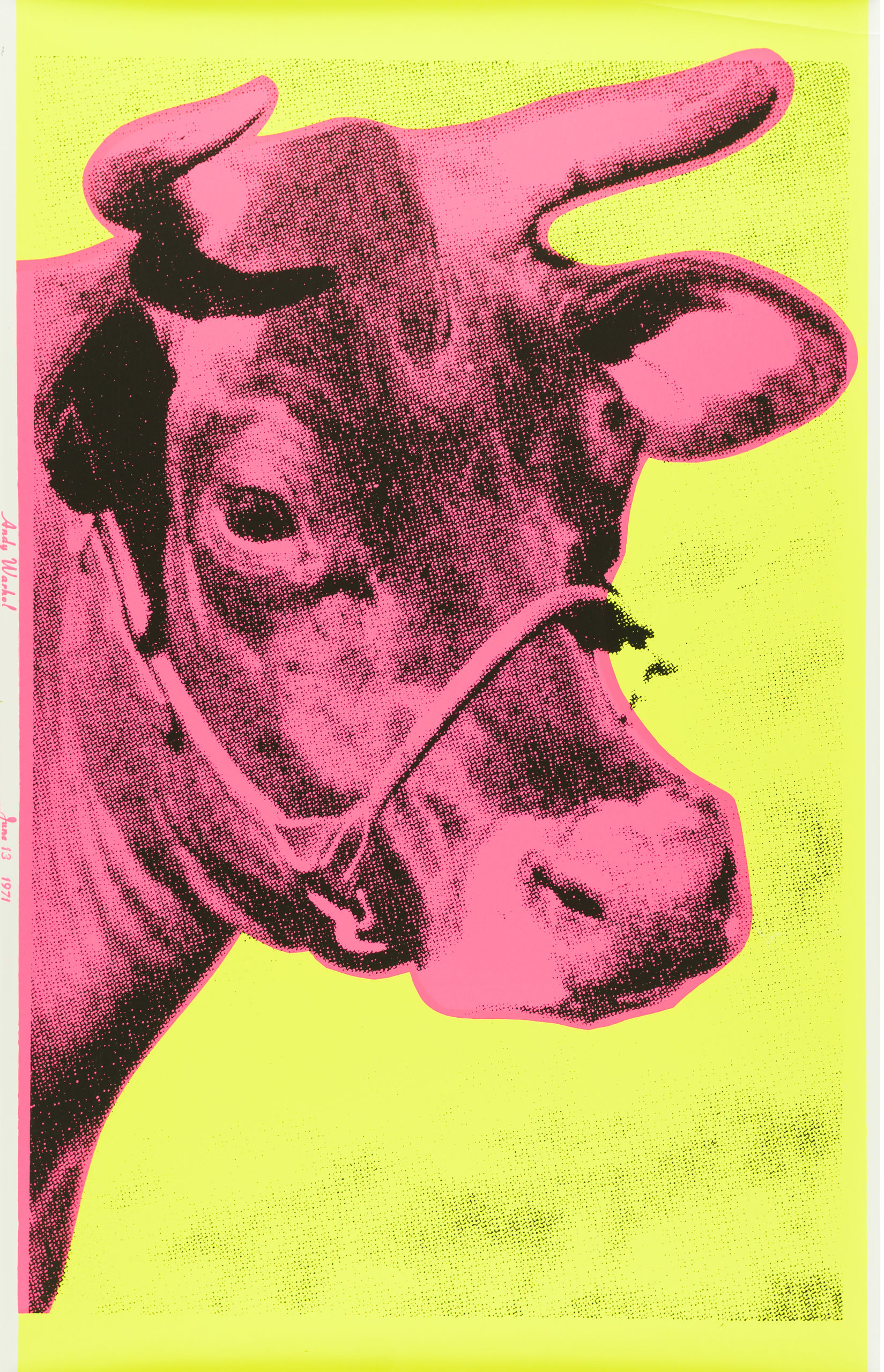 Warhol utilizó como motivo la Vaca roja y amarilla para una exposición en la galería de Leo Castelli en 1966. Según MoMa Magazine, la idea surgió de una broma de Ivan Karp, un empleado de la galería, quien le dijo a Warhol que ya nadie retrataba escenas pastorales costumbristas porque se consideraban demasiado anticuadas. Warhol empapeló entonces las paredes de la galería, de suelo a techo, con las cabezas de Vaca en amarillo y fucsia. La Fundación Canal cuenta con cuatro ejemplos del motivo Vaca en diferentes combinaciones de colores, en total cuatro papeles pintados y dos carteles. | Vaca. Papel pintado para la exposición en la Galería Leo Castelli, Nueva York. Serigrafía, 1966. Cartel.