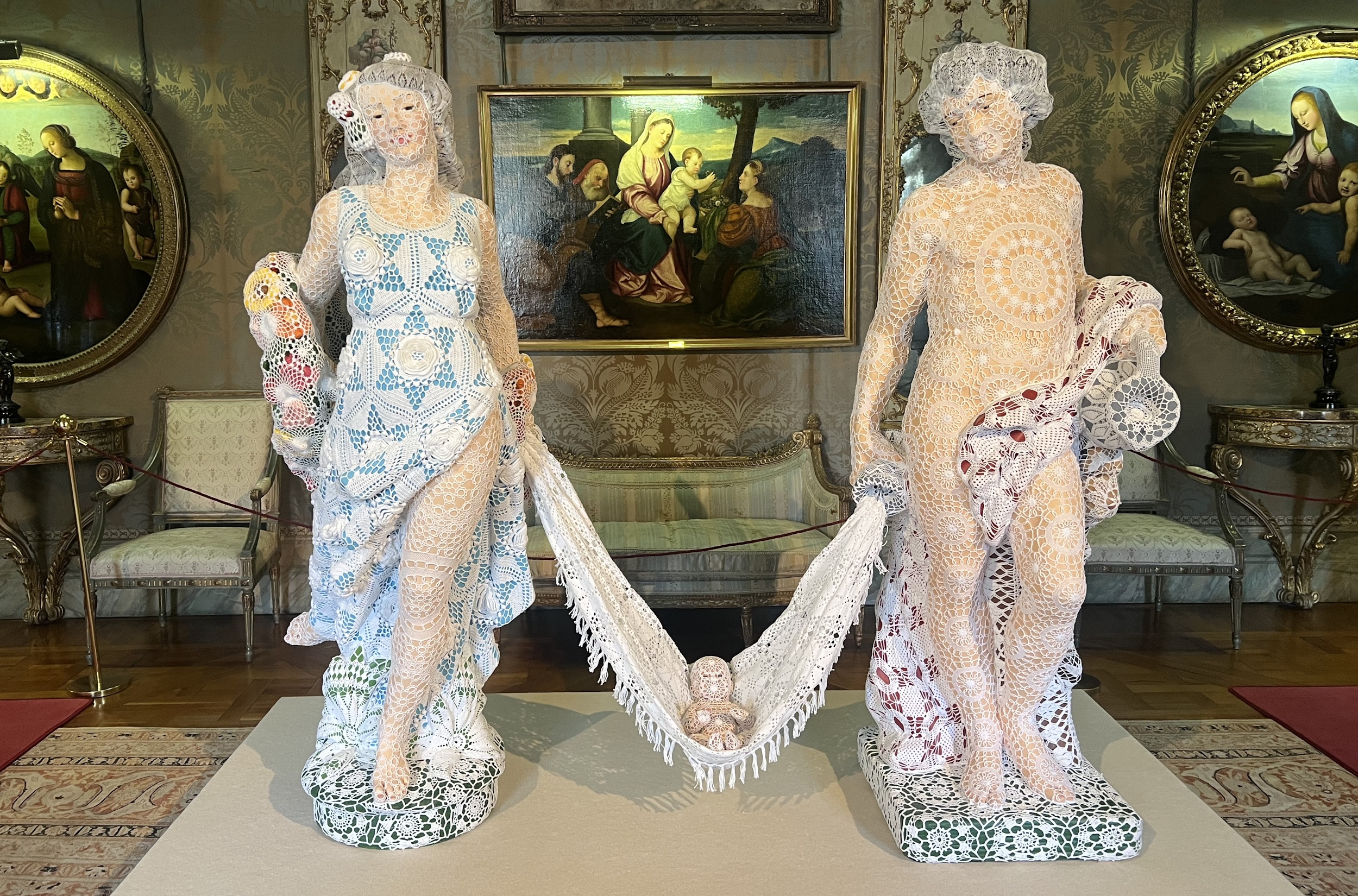 Los visitantes son recibidos por un gran anillo de compromiso fabricado con llantas de coche y vasos de whisky, que se expone en los jardines. "El Palacio de Liria no es un almacén de historia, sino un espacio vivo que se adapta a los contextos contemporáneos sin dejar por ello de preservar su esencia", considera la artista.