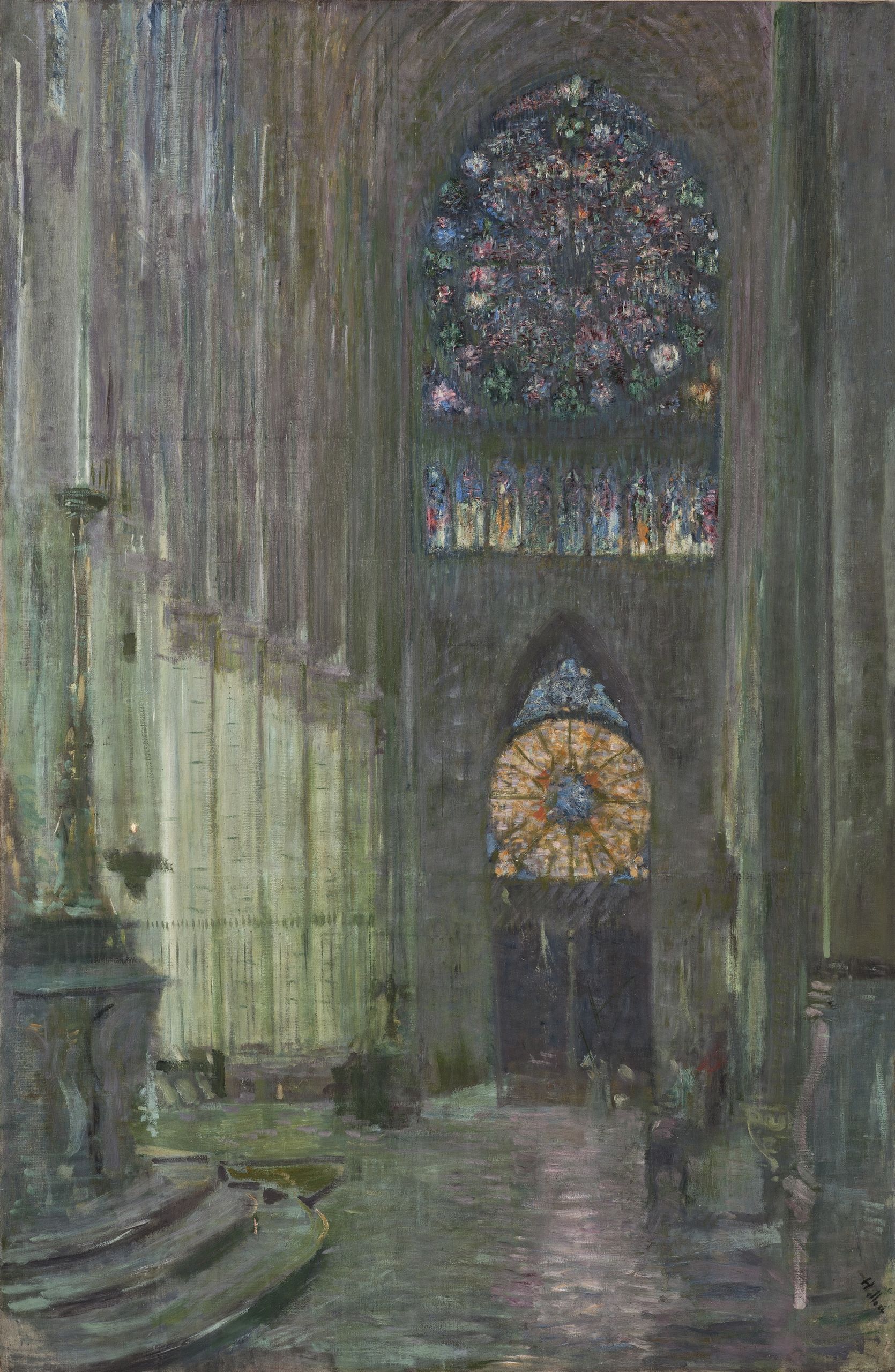 La muestra hace hincapié en el interés del escritor francés por la arquitectura gótica y las catedrales, que visitaba guiado por los escritos del historiador del arte francés Émile Mâle y del inglés John Ruskin, del que fue lector, traductor y analista. | Imagen: Interior de la catedral de Reims (hacia 1892), de Paul-César Helleu.
