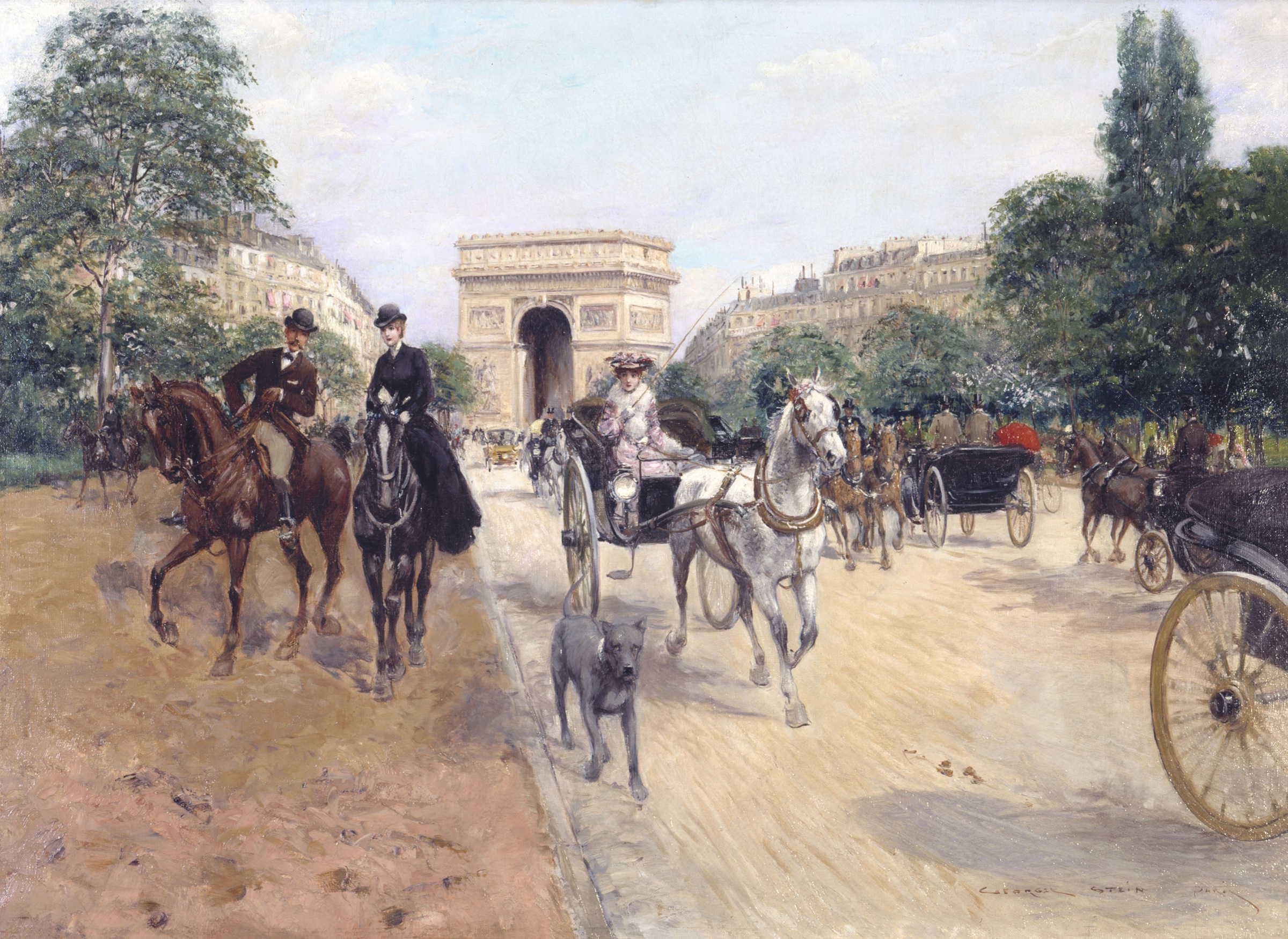 Para entender a Proust es importante conocer el París en el que vivió y su gran transformación tras las reformas urbanísticas del barón Haussmann, con la aparición de la electricidad, los coches, los espectáculos, los restaurantes y los cafés. | Imagen: Jinetes y coches de caballos, Avenue du Bois, hacia 1900, de Georges Stein. Óleo sobre lienzo, 58 × 80 cm.