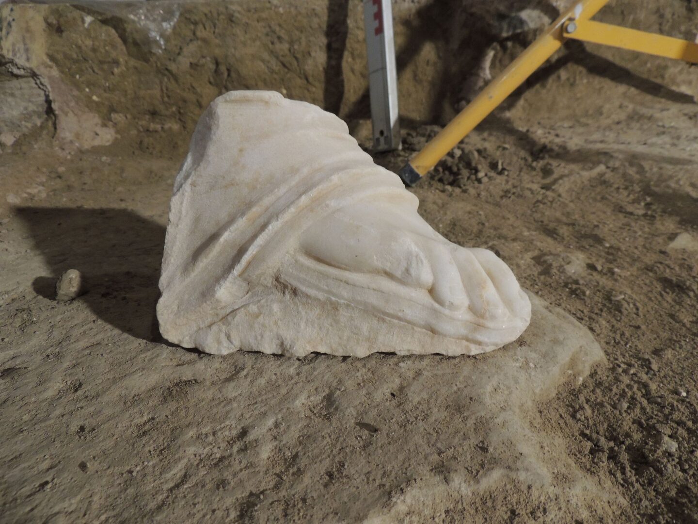 Además, se han recuperado una serie de elementos arqueológicos principalmente de cronología romana entre los que destaca, por su calidad y belleza, el pie de una escultura femenina realizada en mármol. Se trata de la representación de una figura humana a tamaño natural, calzada con una sandalia muy sencilla.