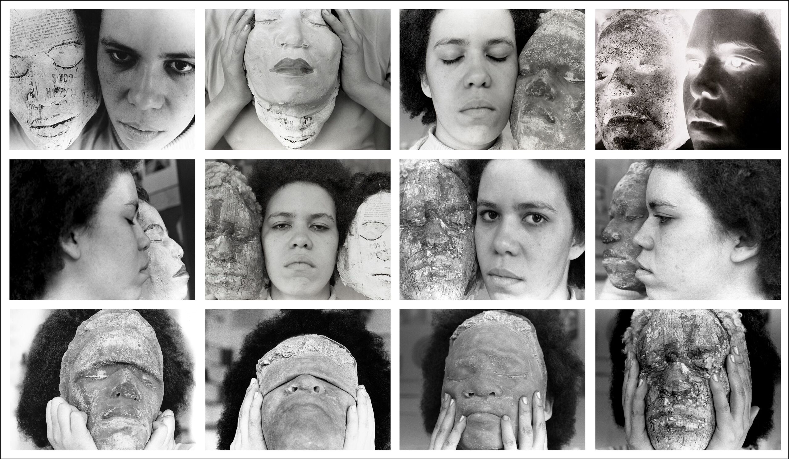 Lizz Williams y sus máscaras, de la serie Violencia mujer (1975-1976). Fotografías en blanco y negro.
