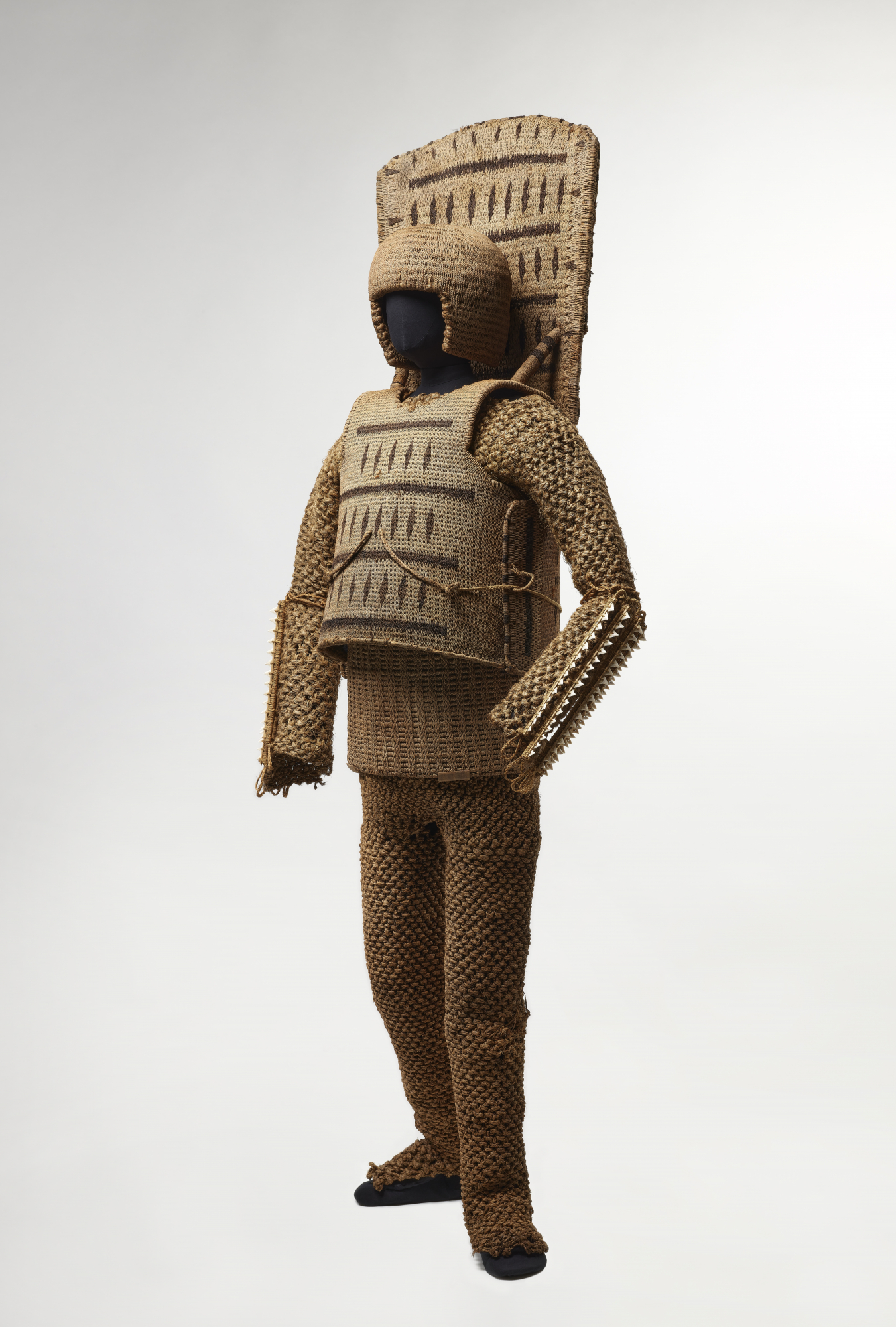 En toda Oceanía, los tejidos son objetos de gran valor que se ofrecen como obsequio en momentos importantes de la vida, como nacimientos, defunciones y bodas. Los más valiosos se convierten en reliquias que pasan de generación en generación. | Imagen: Armadura completa de fibra de coco de Kiribati. 1800-1900. Fibra de coco.