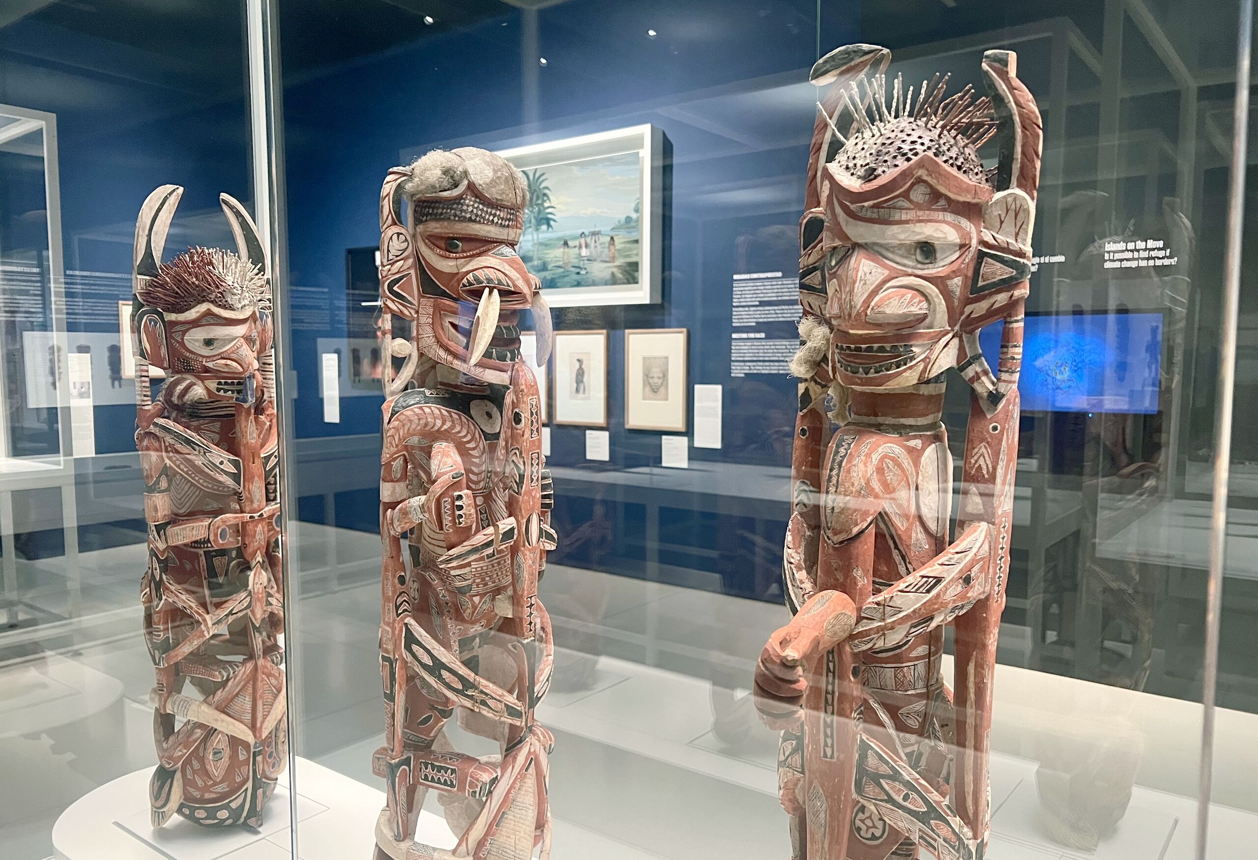 En Nueva Irlanda, estas figuras iban colocadas originalmente en una canoa y se exhibían en el curso de una ceremonia funeral. Recuerdan a quienes han muerto y desaparecido en alta mar o sirven para honrar la vida de un pescador. También podían representar al espíritu de una persona fallecida en su viaje al más allá. | Imagen: Figuras malangan de canoa. Nueva Irlanda, Papúa Nueva Guinea, 1800-1900. Autoría desconocida. Madera. Piezas obtenidas por Hugh Romilly.