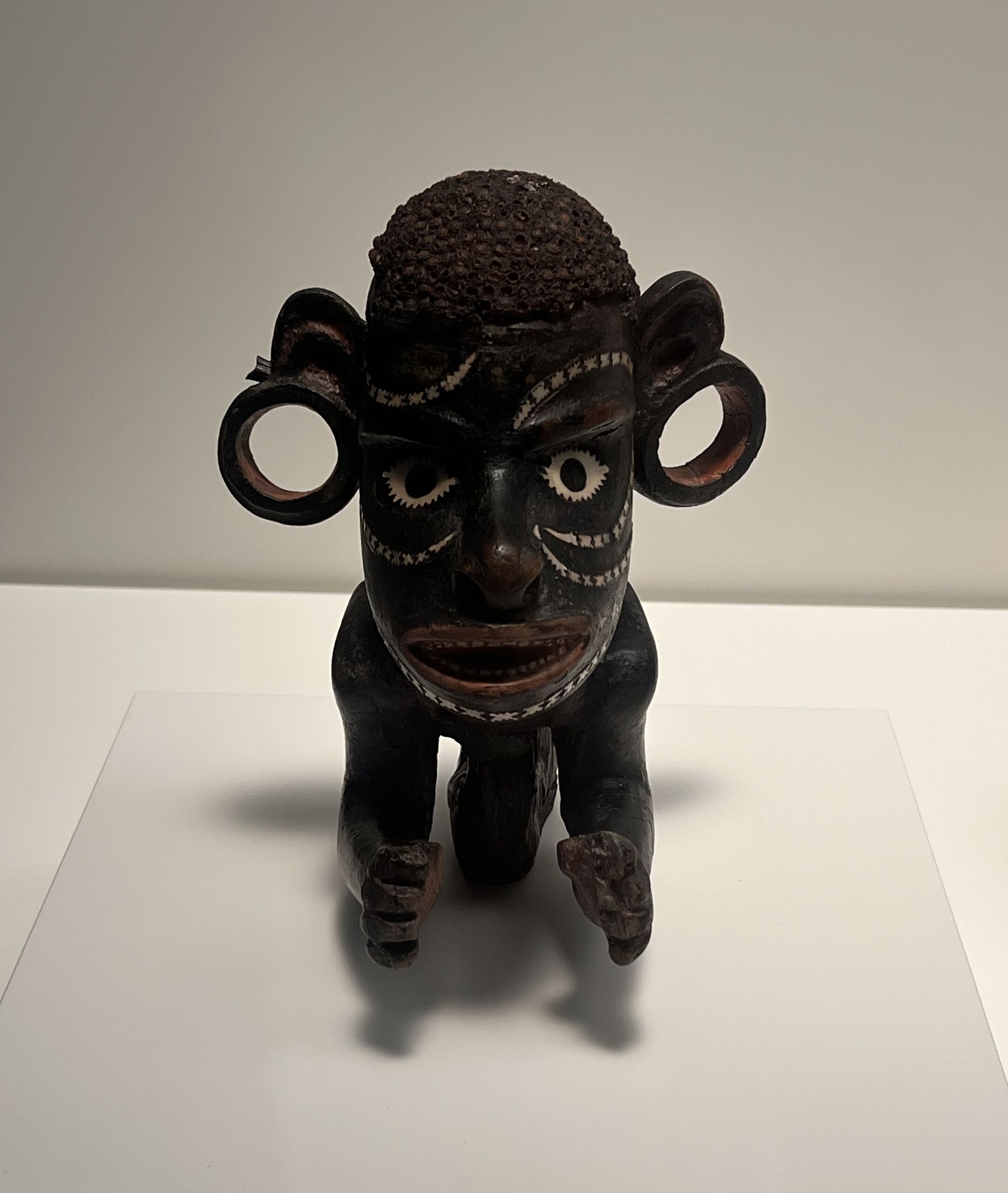 Esta figura, conocida como nguzunguzu, iba colocada en la proa de una canoa bélica de las Islas Salomón. El nguzunguzu quedaba justo por encima de la línea de flotación y hacía las veces de piloto y protector de la embarcación, montando guardia ante la aparición de peligros como, por ejemplo, enemigos o malos espíritus. | Nguzunguzu (mascarón de canoa). Nueva Georgia, Islas Salomón, 1800-1900. Autoría desconocida. Madera y concha de madreperla. Donación de L. T. Hope