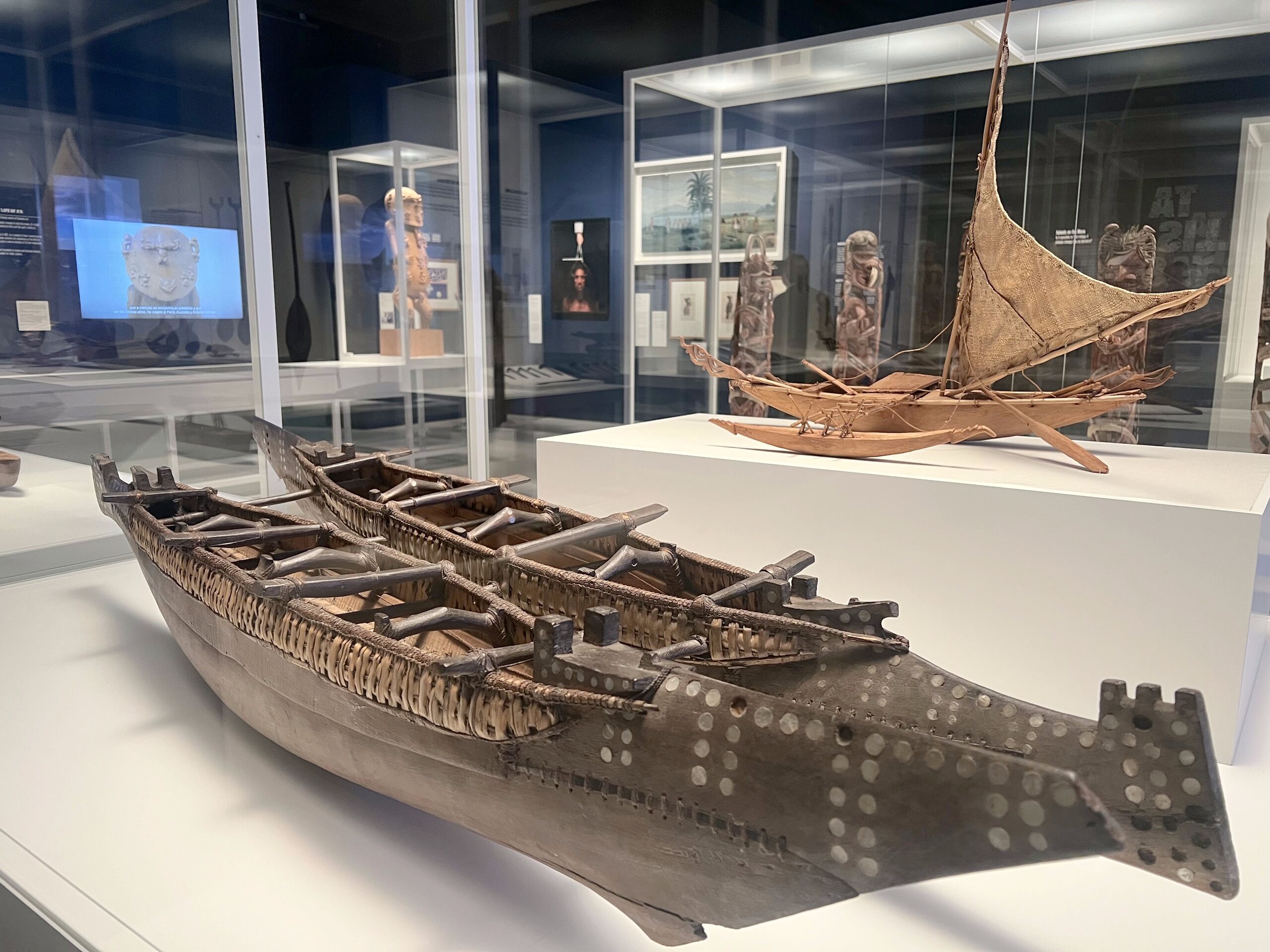 Este tipo de canoas bélicas, conocidas como tomokos, de Roviana, en las Islas Salomón, se utilizaban en expediciones de caza de cabezas a islas vecinas. Además de apoderarse de las cabezas de los enemigos, capturaban esclavos. Las cabezas se empleaban como demostración visible del poder de los jefes y en rituales hasta principios del siglo XX, tras la intervención colonial. | Imagen: Maqueta de tomoko (canoa bélica). Roviana, Islas Salomón, 1900-1920. Madera y concha. Donación de Mary Edge-Partington.