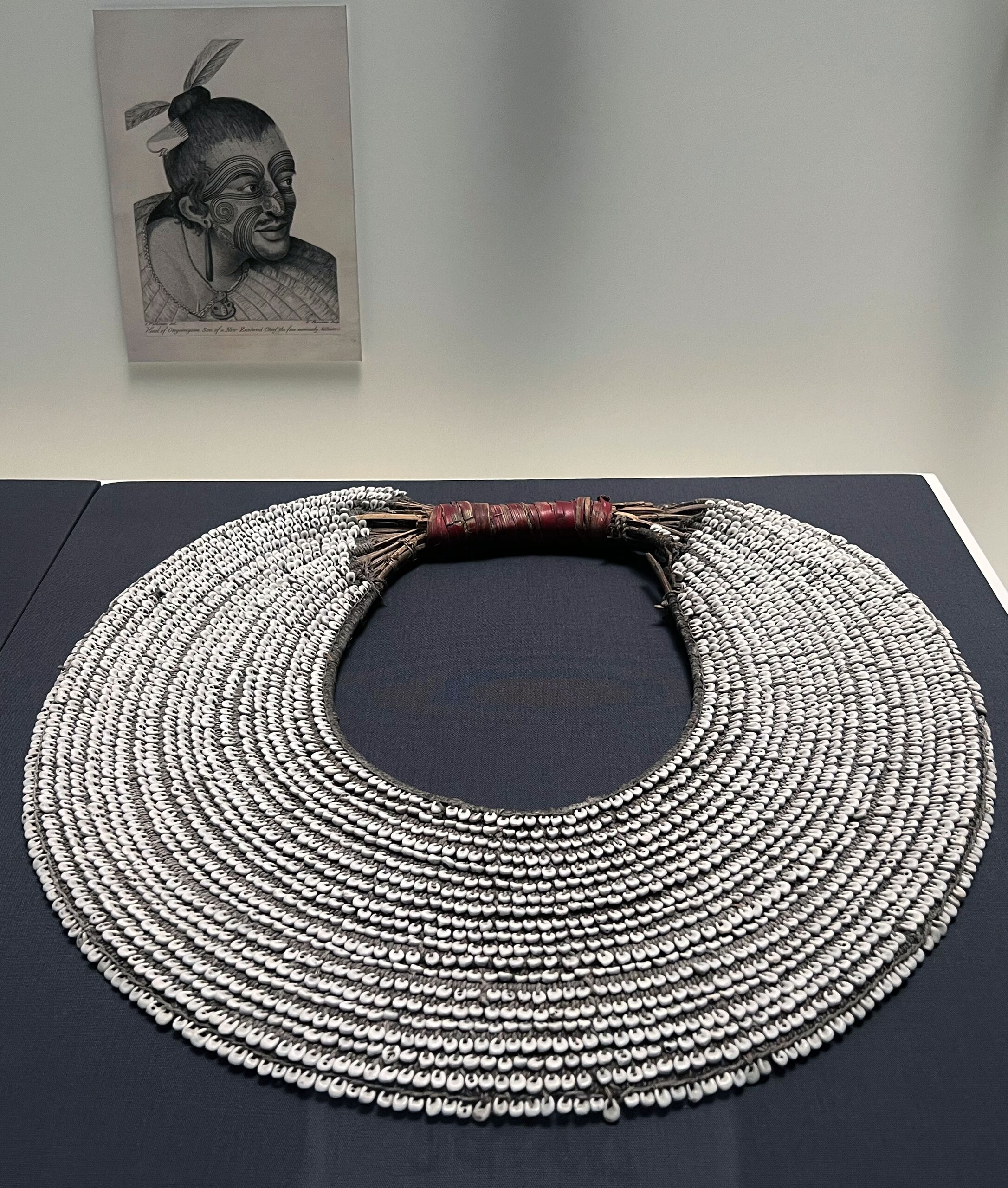 Este adorno, conocido como midi, se llevaba en la batalla como símbolo de estatus y para ofrecer protección espiritual al guerrero. Las conchas de nasa encajan unas junto a otras y son insertadas en la estructura de fibra. | Imagen: Midi (collar de conchas). Nueva Bretaña, Papúa Nueva Guinea, 1800-1884. Autoría desconocida. Cañía, fibra y conchas de nasa. Donación de Francis Russell