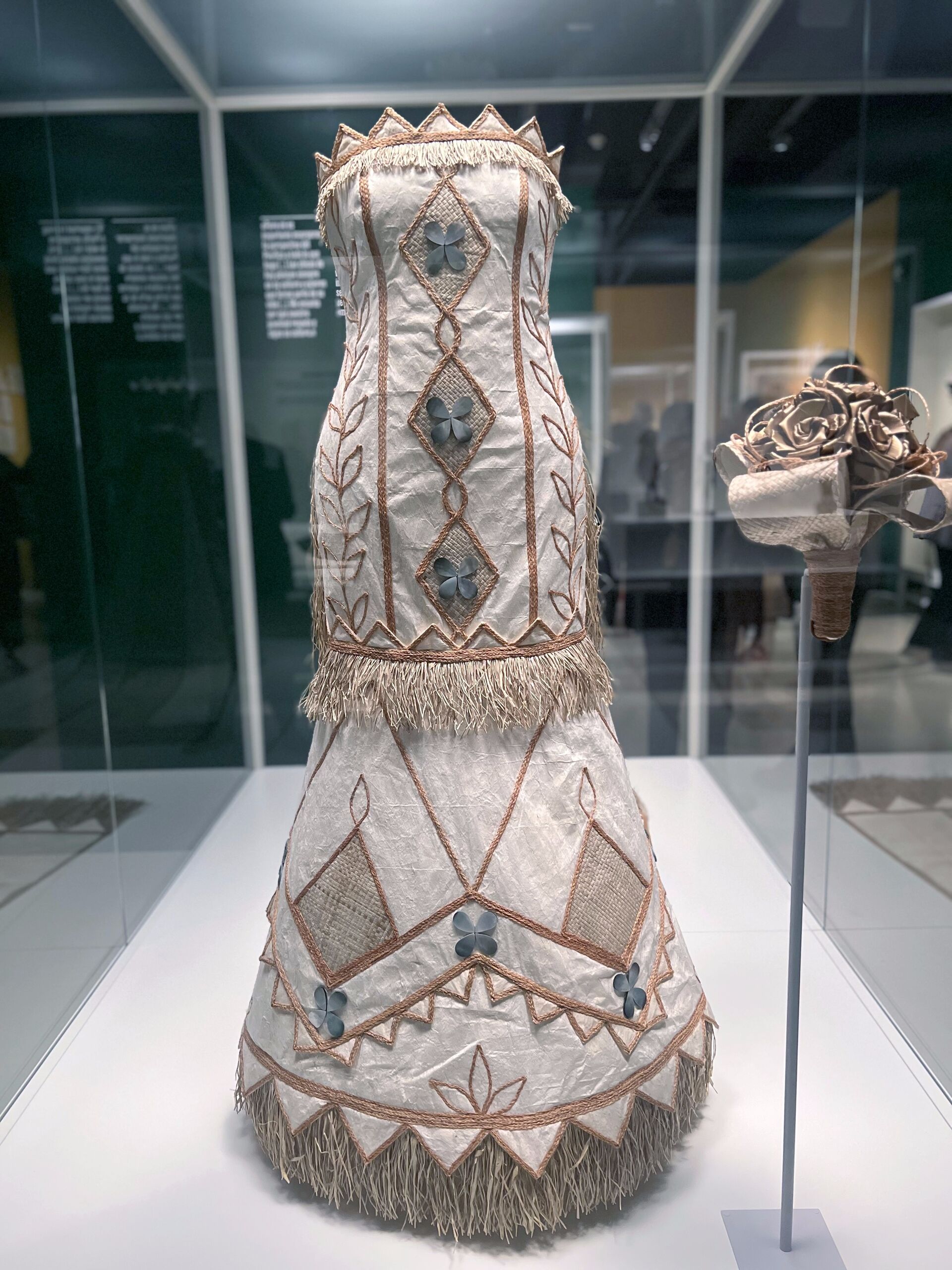 El hilo conductor de la exposición en conocer cómo los artistas han conseguido la comunión entre innovación y tradición. Un ejemplo es este vestido de novia de Paula Chan Cheuk, nacida en Samoa y de ascendencia samoana y china. Confecciona sus trajes con tela de corteza, o siapo, como se conoce este tipo de tejido en Samoa. Fue la primera diseñadora que adaptó este material tradicional para crear prendas contemporáneas. | Imagen: Vestido de novia de tela de corteza, 2014. Aotearoa (Nueva Zelanda). Corteza de morera de papel, hoja de pandano, fibra de coco, concha de madreperla y harakeke (lino de Nueva Zelanda).