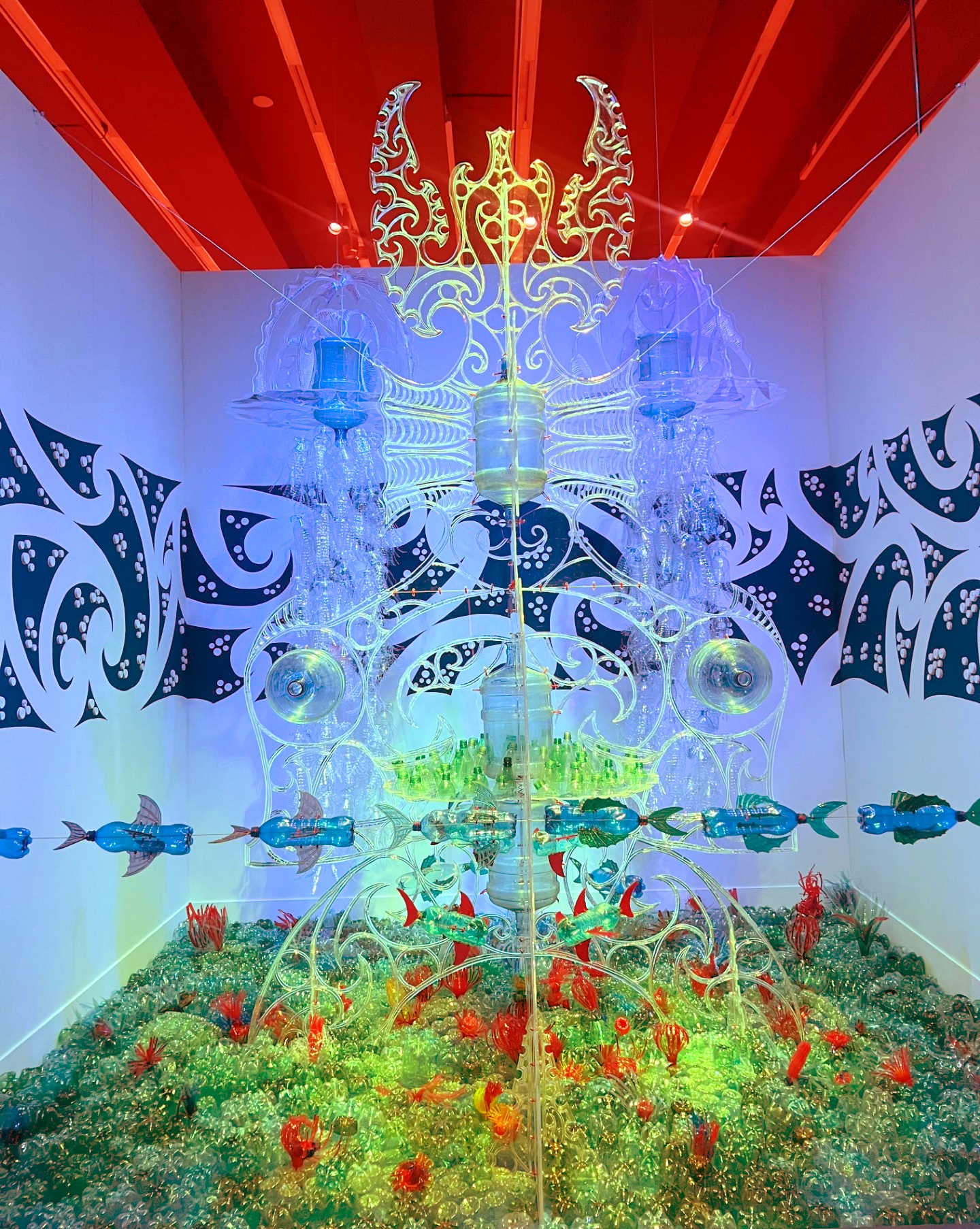 El artista maorí George Nuku estuvo presente en la exposición y presentó su instalación, una visión del mundo del futuro cubierto de plástico. | Imagen: Bottle Ocean, 2125, obra de George Nuku. Nueva Zelanda, 2025. Plastico. Colección del artista, Francia
