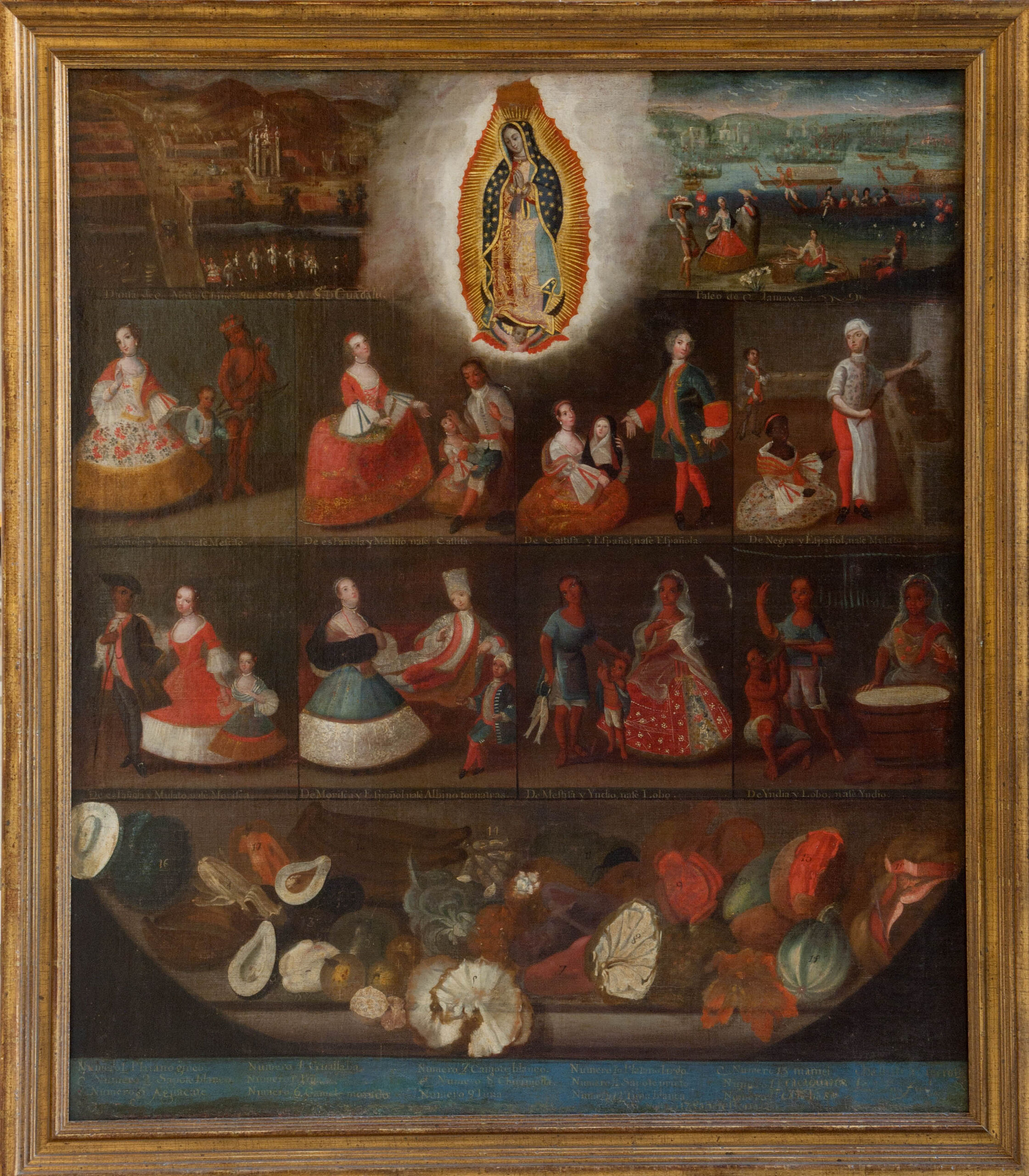 Cuadro de castas, vista de la colegiata de Guadalupe y vista del paseo de la Viga, de Luis de Mena (act. a mediados del siglo XVIII). Óleo sobre lienzo h. 1750. Madrid, Museo de América