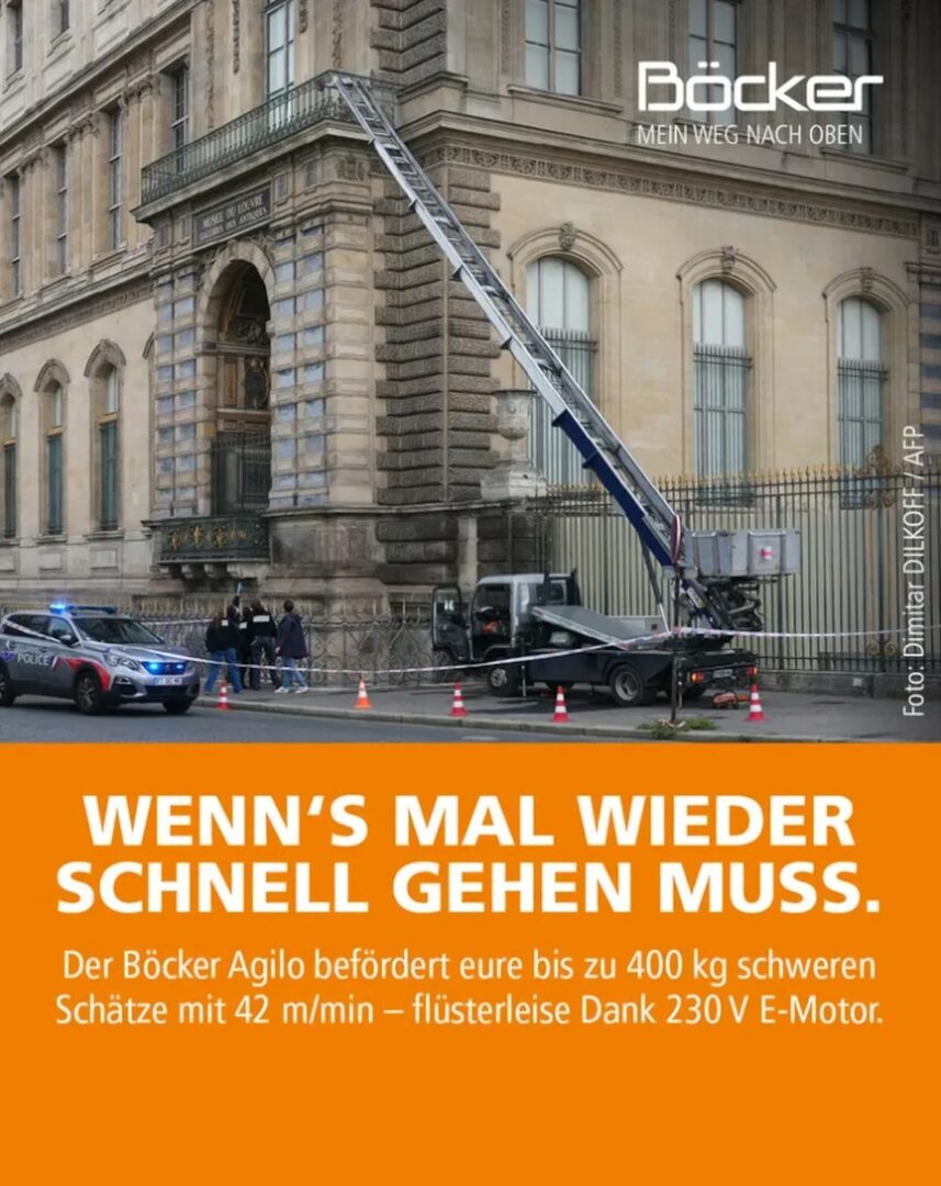 El robo de película en el Museo del Louvre de París, en el que se sustrajeron joyas de incalculable valor y que ha conmocionado Francia, no fue una mala noticia para todos. Los dueños de la empresa Böcker, que fabrica maquinaria, se dieron cuenta de que el montacargas con el que los ladrones accedieron a la sala donde se exhibía el arte napoleónico era suyo y decidieron convertir la imagen del robo en un cartel publicitario.