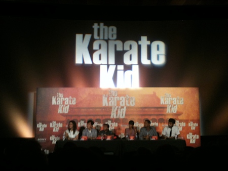 Su hijo Jaden fue mucho menos locuaz, pese a ser el protagonista de la película. Señaló que el entrenamiento para las escenas de acción fue duro, pero que sólo sufrió daños en una rodilla. Y que lo verdaderamente dificil fue tener que "besar a una chica delante de sus padres". Aunque matizó muy deprisa que no era su primer beso.