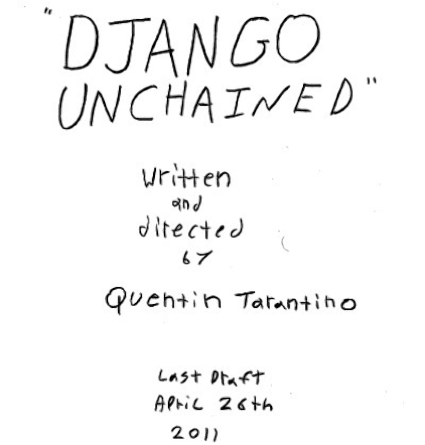 Lo que ven arriba es la portada –filtrada por un usuario de Twitter- del borrador definitivo del guión de Django Unchained (Django desencadenado), o la que ya es oficialmente la próxima película de Quentin Tarantino. La letra manuscrita es, no lo duden, del propio director, que acostumbra a titular a mano sus textos. Éste, de 168 páginas (y ya saben, una página equivale a un minuto de película), obra en poder del periodista cinematográfico Jeffrey Wells, autor del blog Hollywood Elsewhere. La película empezará su producción en otoño o finales de verano, con lo que todo lo que les hemos contado es noticias, no rumor: la próxima película de Tarantino será un western.