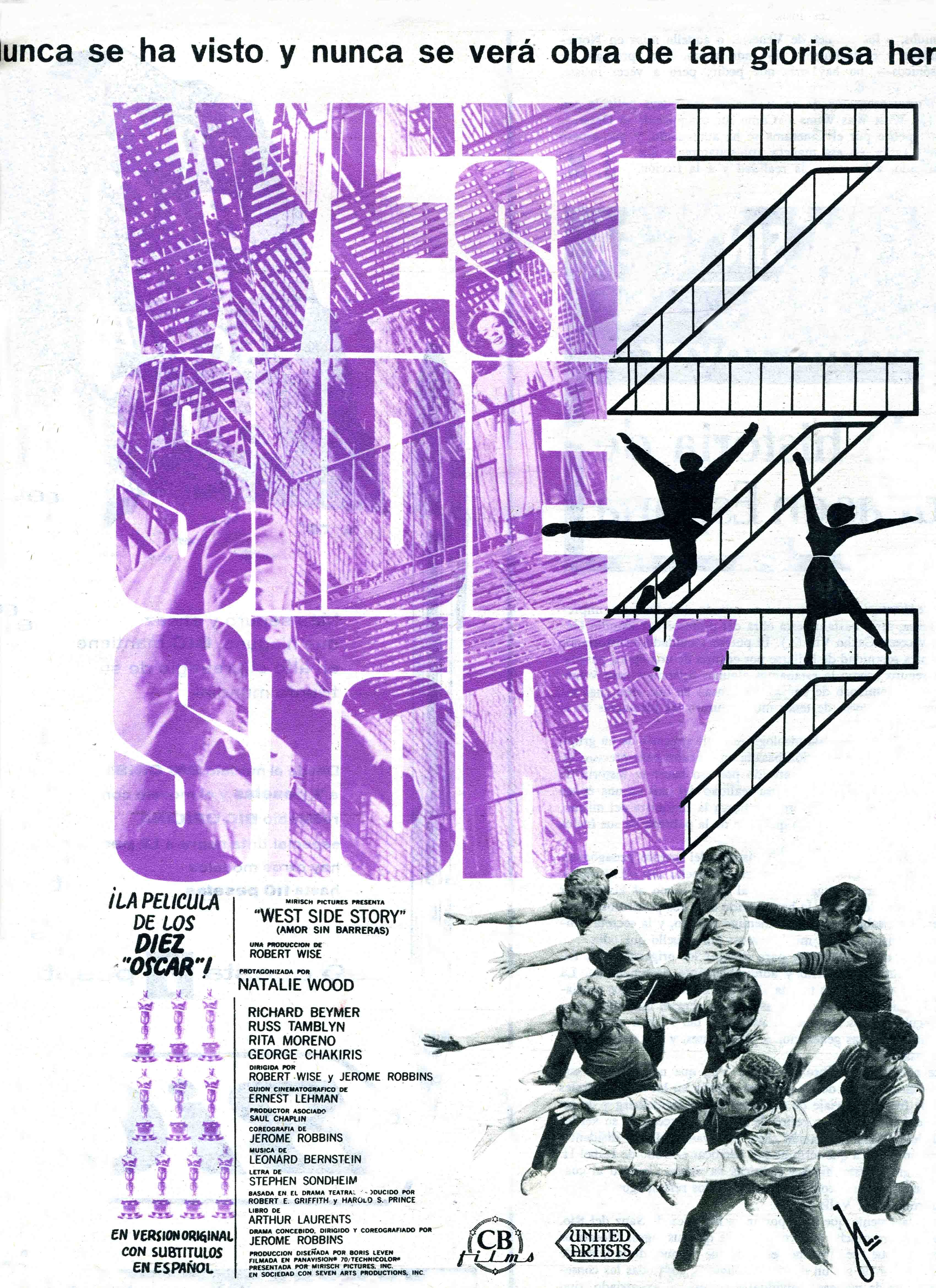 Variación del cartel para revistas españolas. Como "Pictorial Consultant", Bass rodó el prólogo, dibujó el story-board de la primera escena de baile y creó los títulos de crédito y cartelería de "West Side Story".