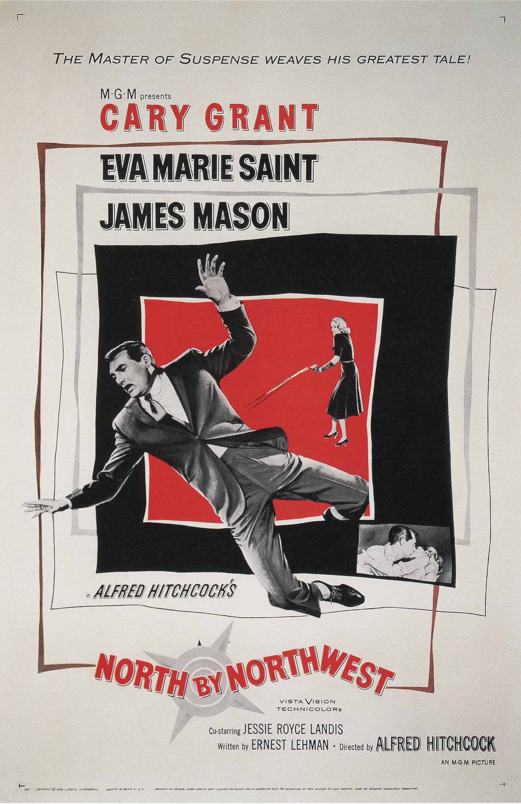 De nuevo Saul Bass colabora con Hitchcock en los créditos, sumamente estilizados e inquietantes, de una de sus grandes comedias de suspense: Con la muerte en los talones (1959). El cartel vuelve a reflejar las dos obsesiones hitchcockianas: la caída en el vacío y la rubia peligrosa.