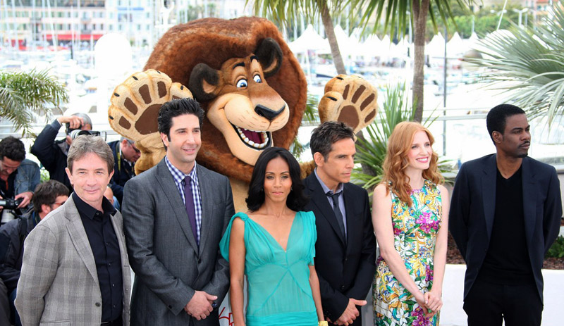 Chastai, con el resto del reparto de voces: Martin Short, David Schwimmer, Jada Pinkett-Smith, Ben Stiller y Chris Rock.