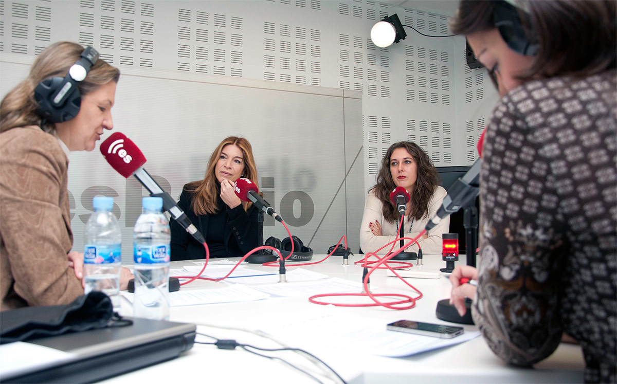 Un momento gracioso durante el programa, en el que Lucía Álvarez y María Casal tratan de desenredar los auriculares.