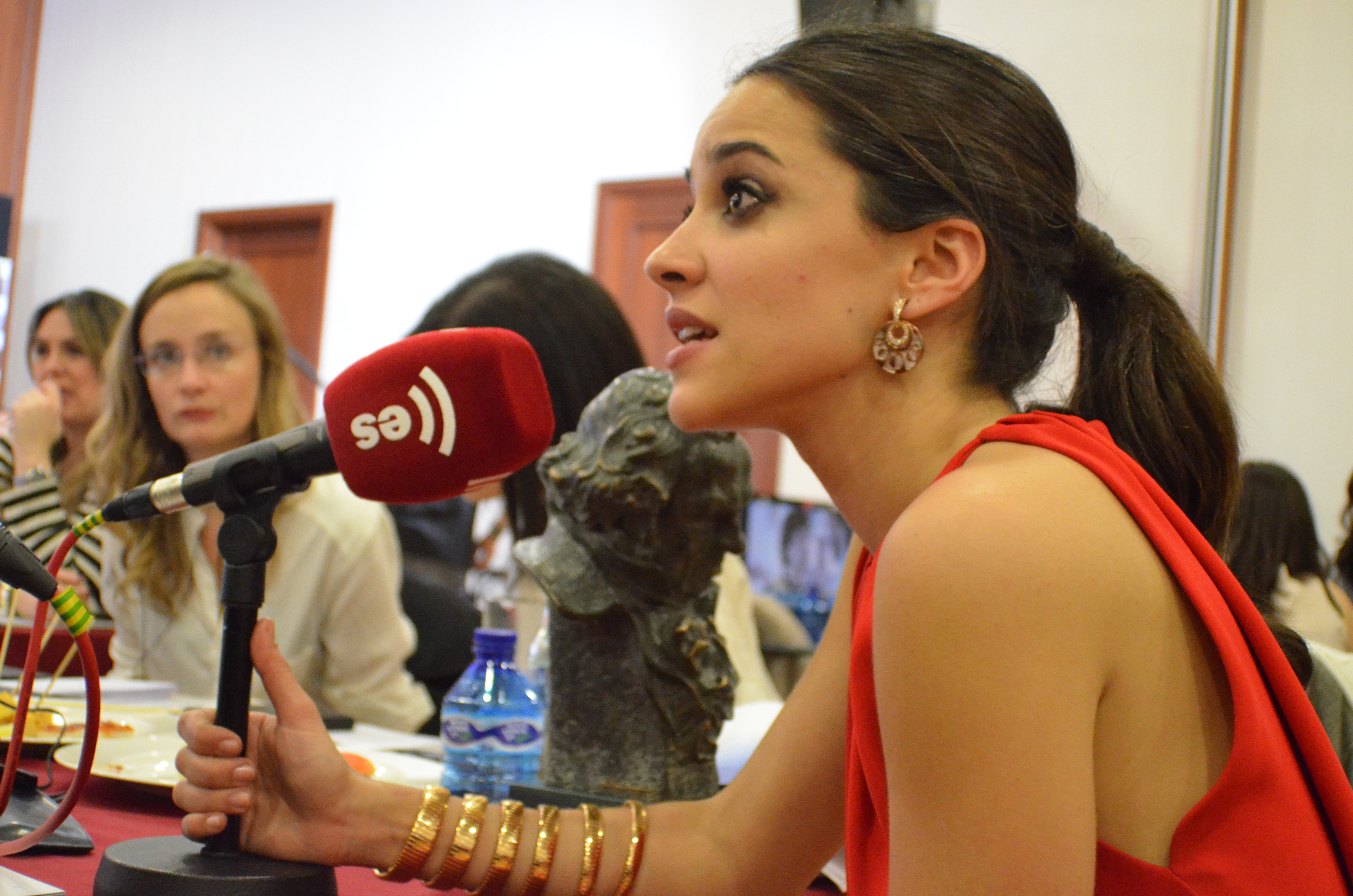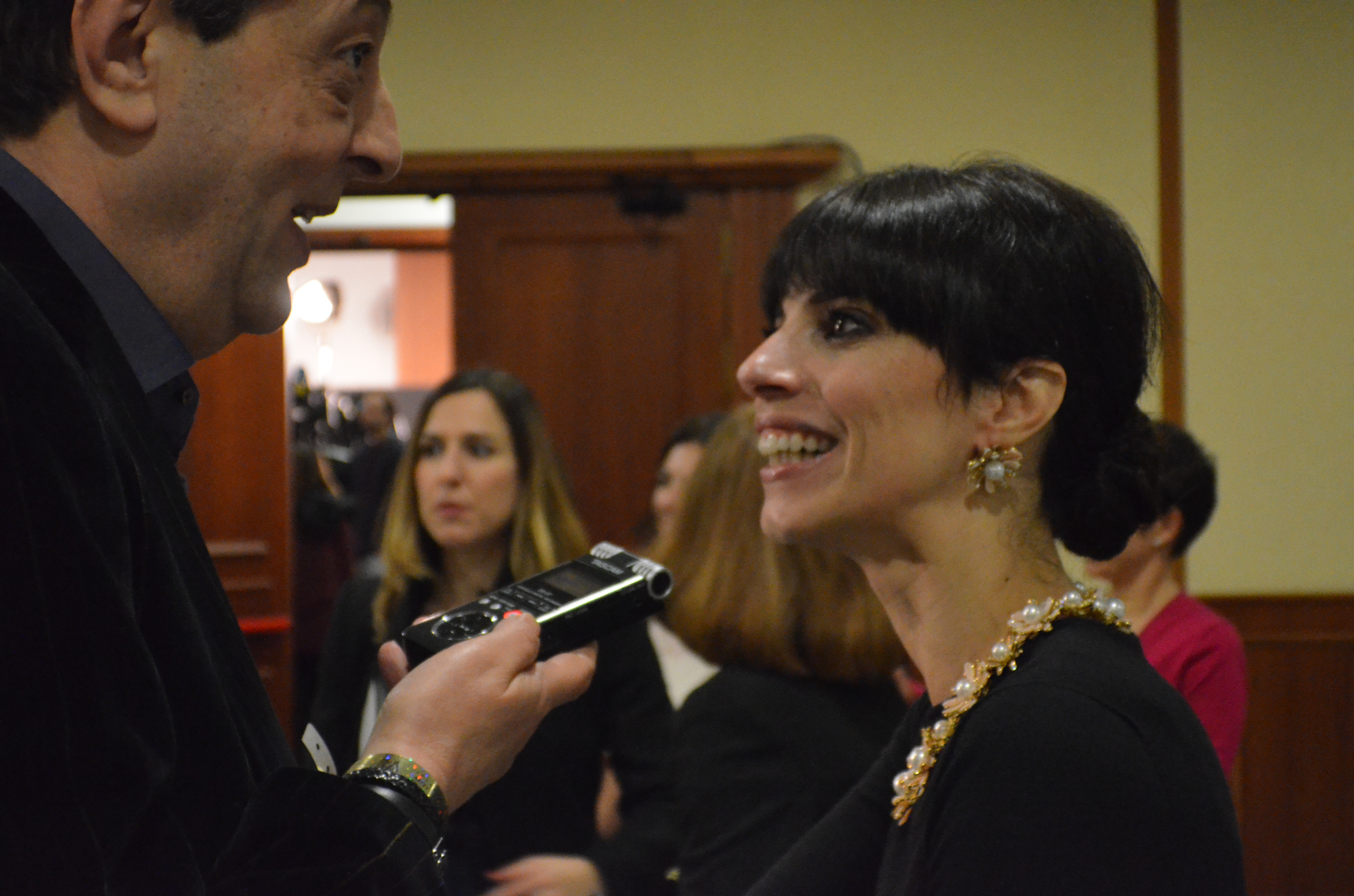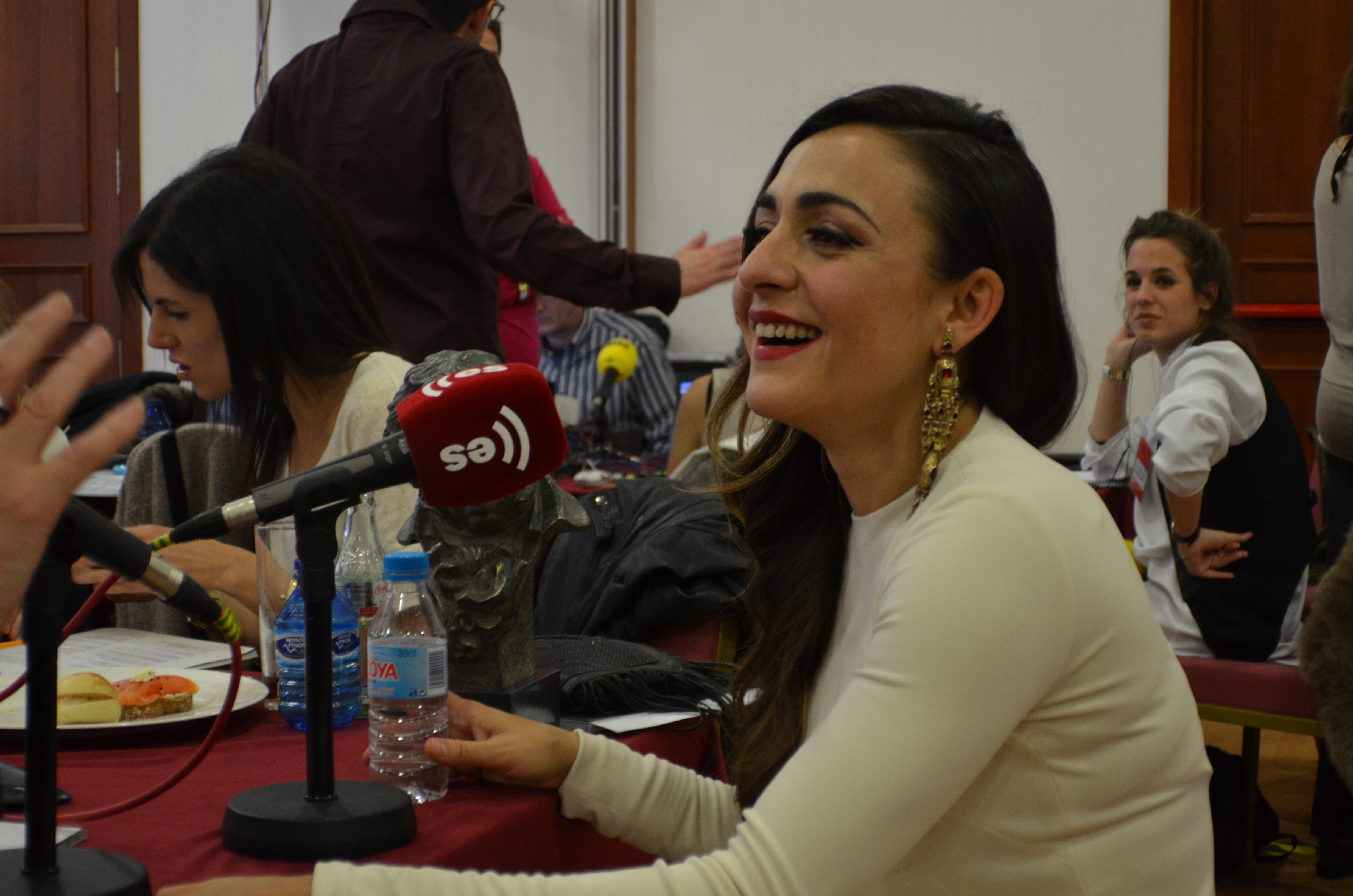 La actriz ríe relajadamente en la sala de prensa tras haber dicho en el escenario que su padre murió en un hospital público "sin mantas ni agua".