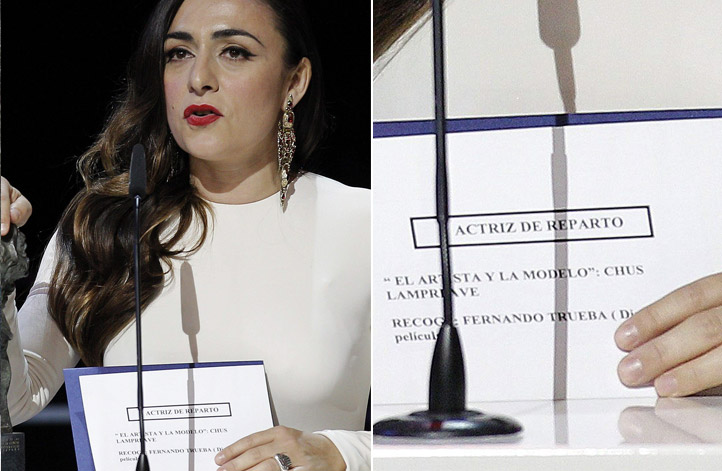 El discurso de Candela Peña no fue lo único que ha provocado un incendio en las redes sociales. Finalizada la Gala, una fotografía de la actriz mientras recogía el premio la ha vuelto a poner en el centro de la diana. Y es que en la instantánea, distribuida por la agencia Efe, se observa a Peña en el atril pronunciando su discurso, sosteniendo con la mano izquierda un sobre en el que se lee perfectamente: "Actriz de reparto. El Artista y la modelo, Chus Lampreave. Recoge el premio: Fernando Trueba".