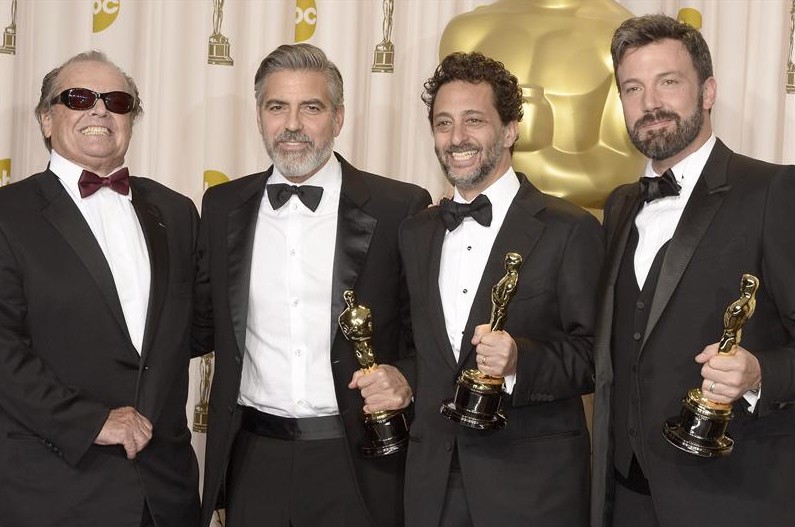 El equipo ganador por Argo, escoltados por Jack Nicholson. Todos ellos de Armani y todos ellos bien.