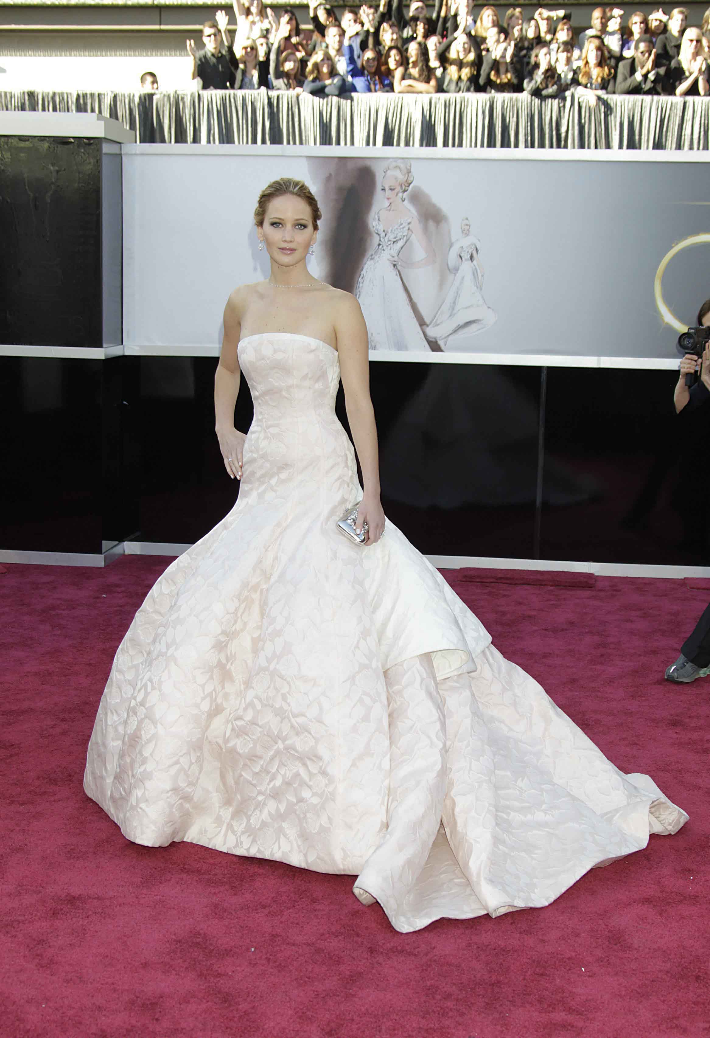 Otra imagen del enorme diseño alta costura de Dior de Jennifer Lawrence, que se estrelló contra el suelo en las escaleras al ir a recoger su Oscar a la mejor actriz.
