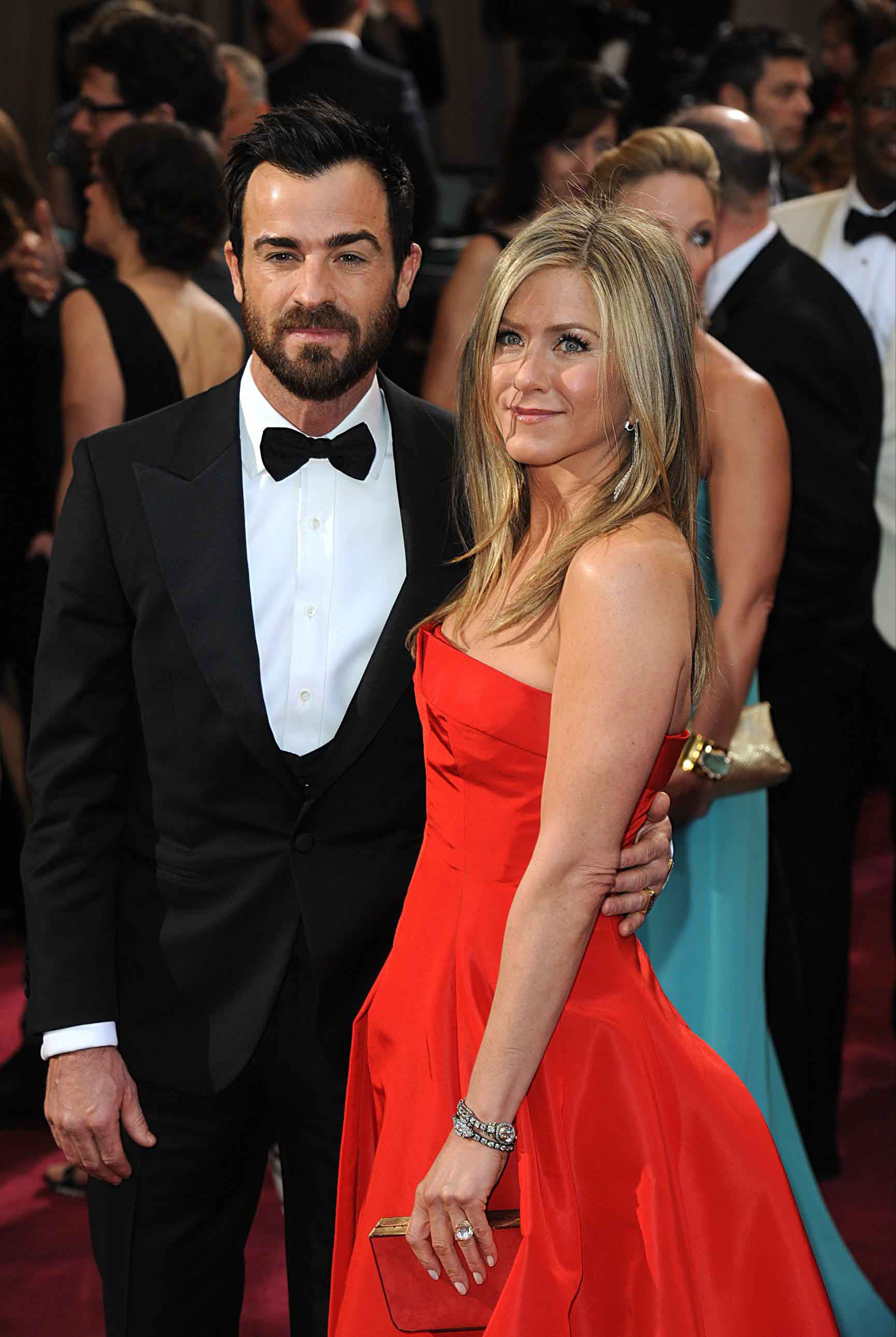 Jennifer Aniston y su prometido, el guionista y actor Justin Theroux. Ella, con Valentino rojo intenso y con mucho vuelo, se adueñó de la alfombra y la mitad de la gala.