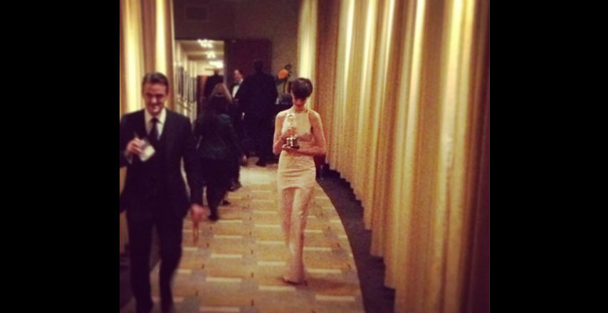 Anne Hathaway en los pasillos del Dolby Theatre con su Oscar.
