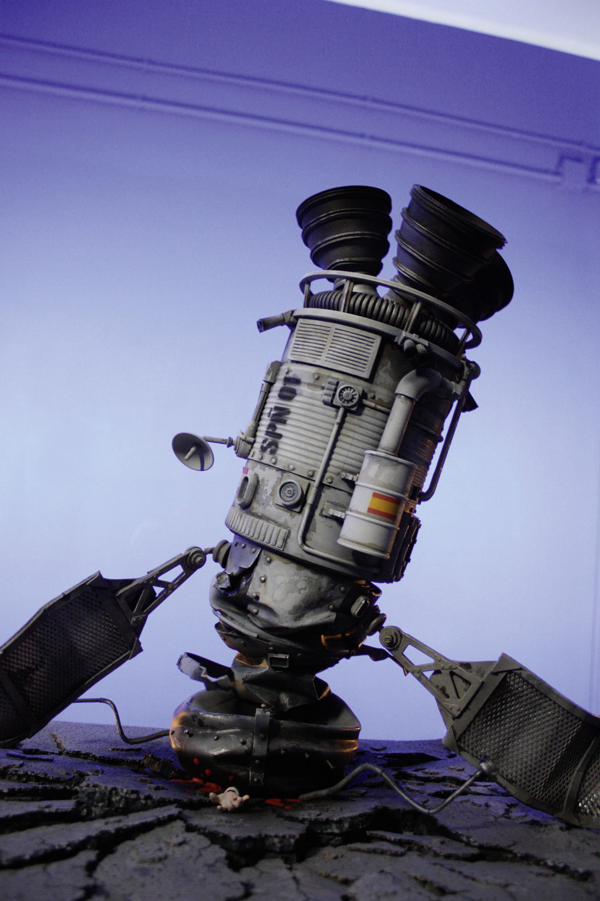 Escena del corto de ciencia ficción Juego de niños (1999). Los robots están fabricados con piezas recicladas: tapas de boli, fragmentos de juguetes, jeringuillas y cable telefónico. Llorens dirige su empresa de animación Potens Plastianimation. (Ver vídeo tráiler de cortos de Pablo Llorens)