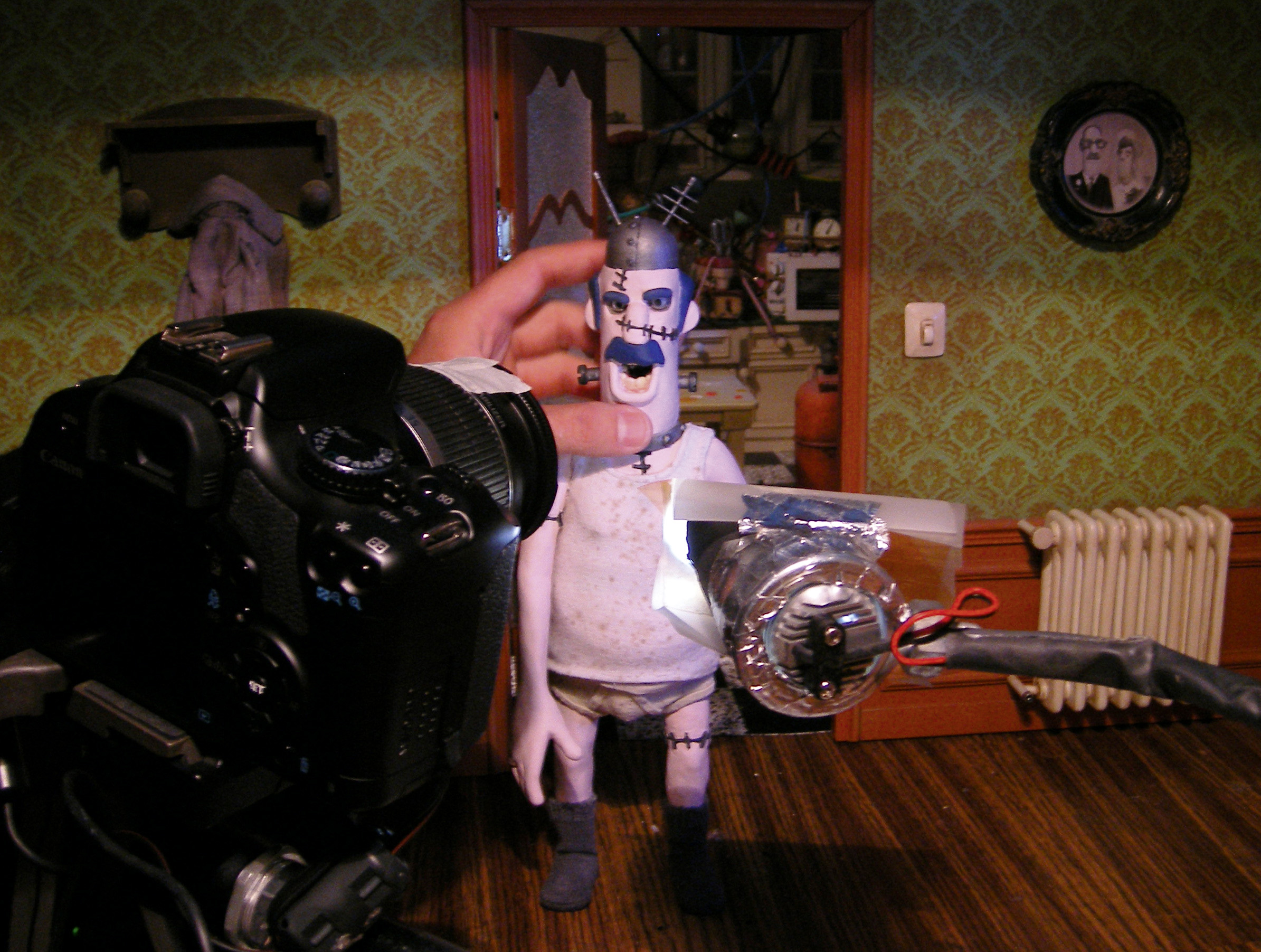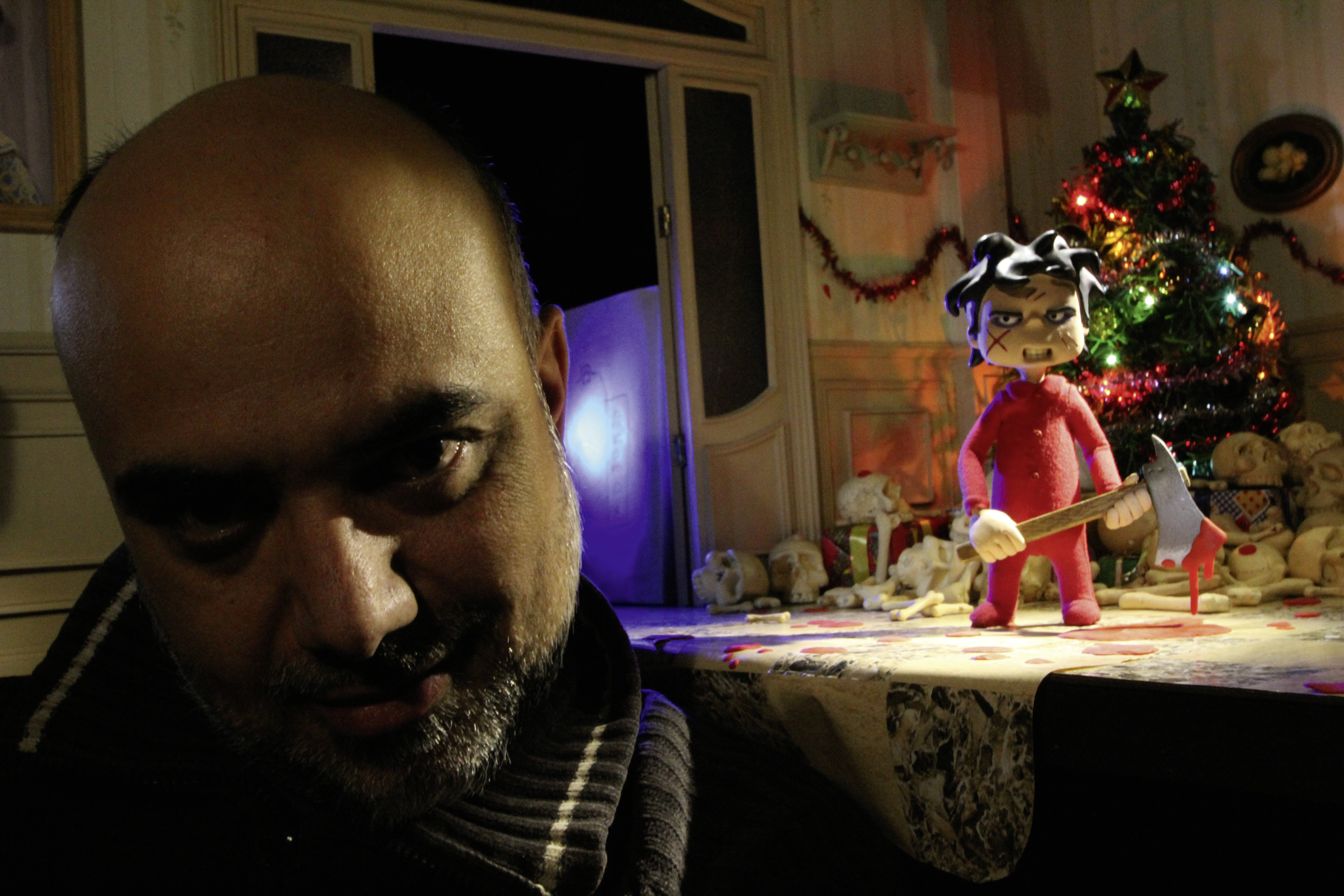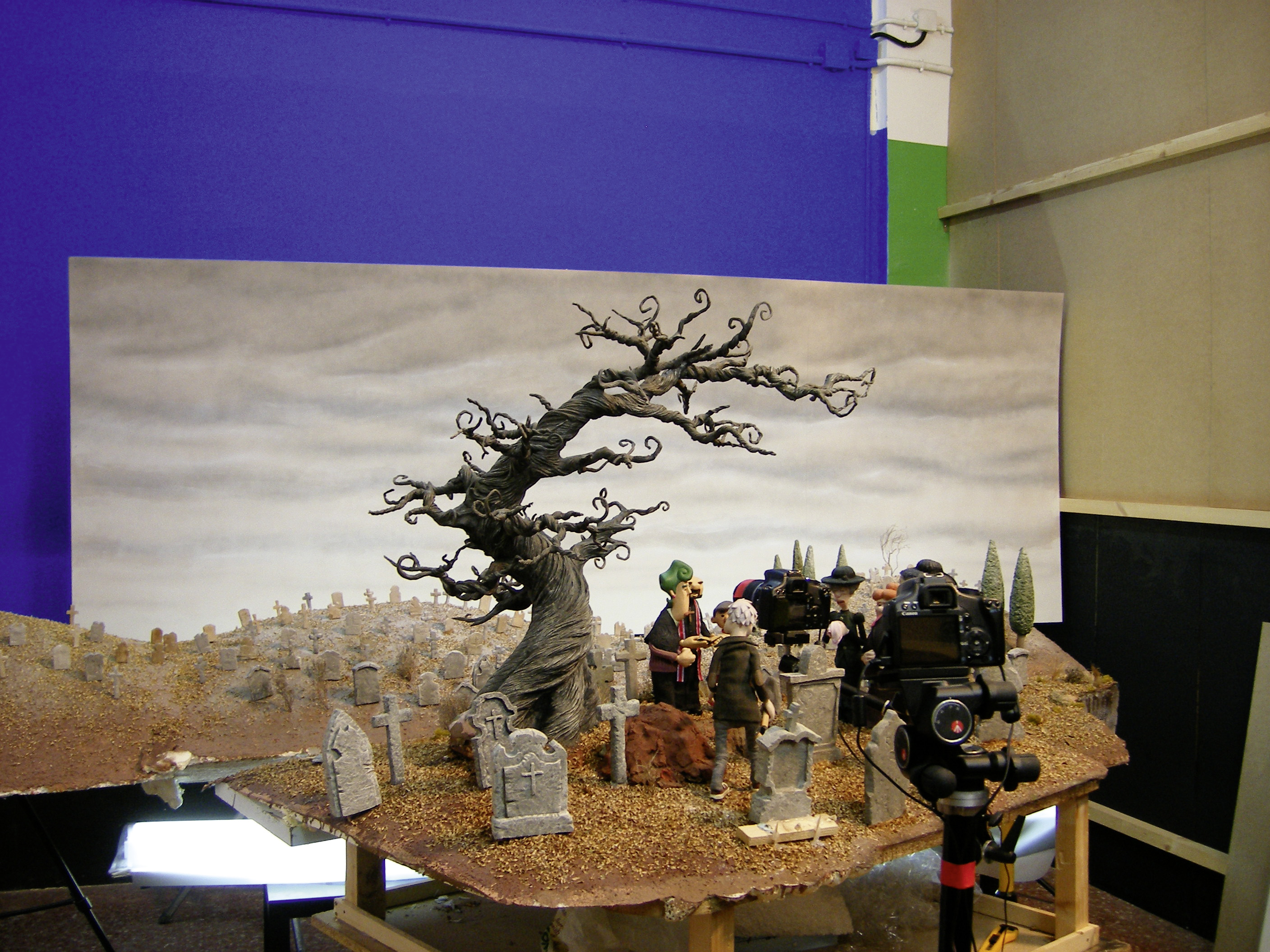 Sam delante del set de Pos eso, con Damien en escena. El largometraje es una versión cañí de El exorcista y La profecía, todavía en fase de producción. Una comedia de acción satánica en plastilina.