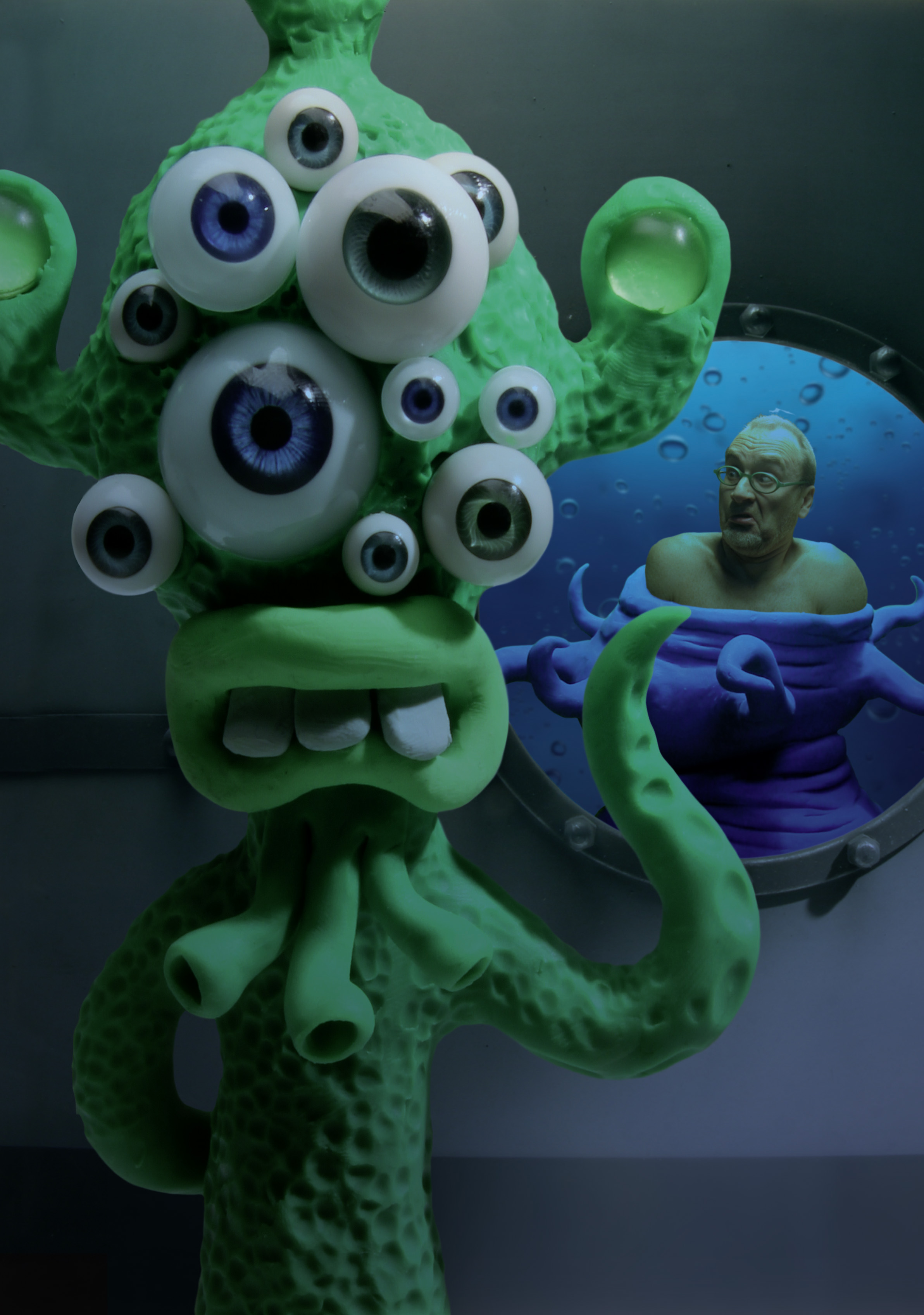 Pablo Llorens atrapado por un alienígena multiojos en La maldición de los hombres triángulo. Desde 1987 trabaja con la plastilina. Ha ganado dos Goya, uno en 1996 por el psicho-thriller Caracol, col, col, y el segundo en 2005 por el surrealista El enigma del niño croqueta. (Ver vídeo "La maldición de los hombres triángulo")