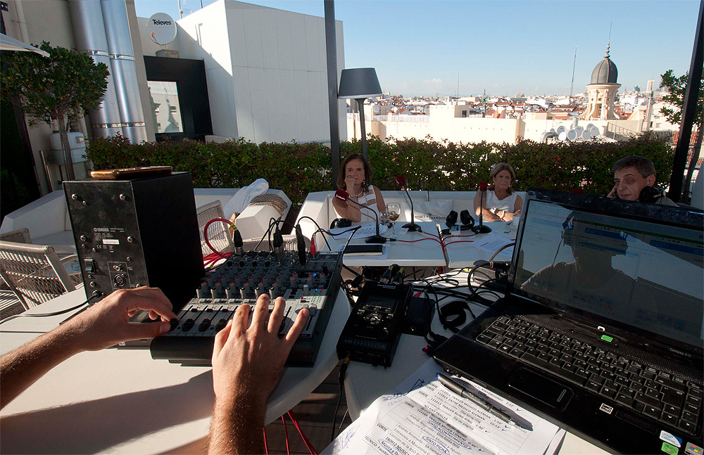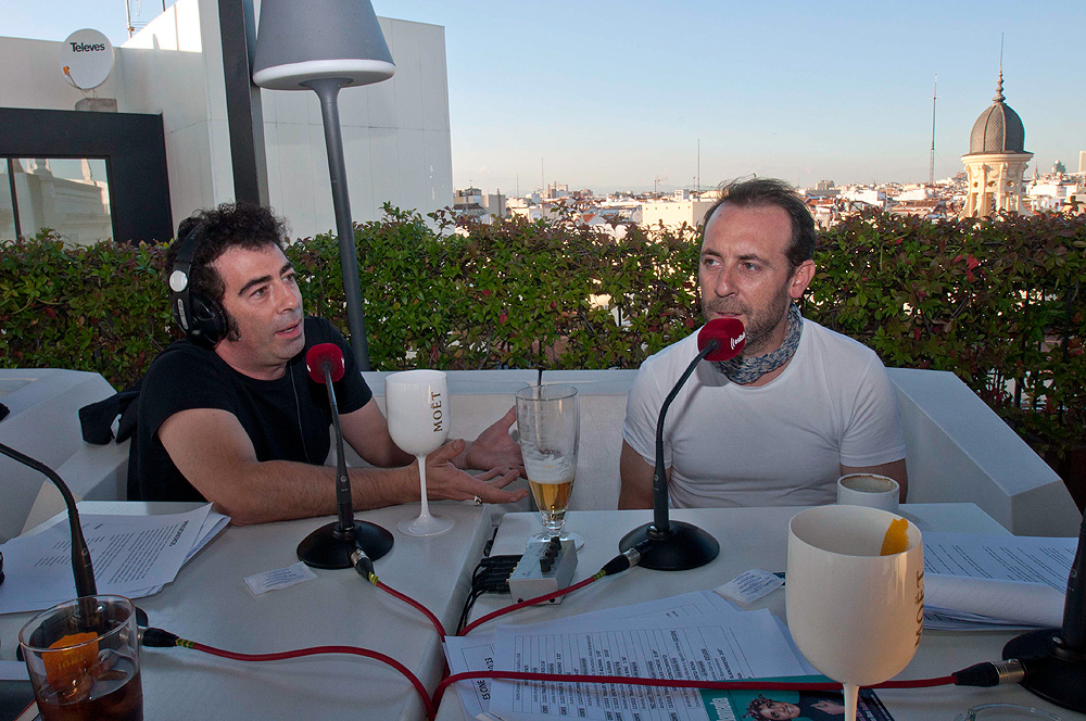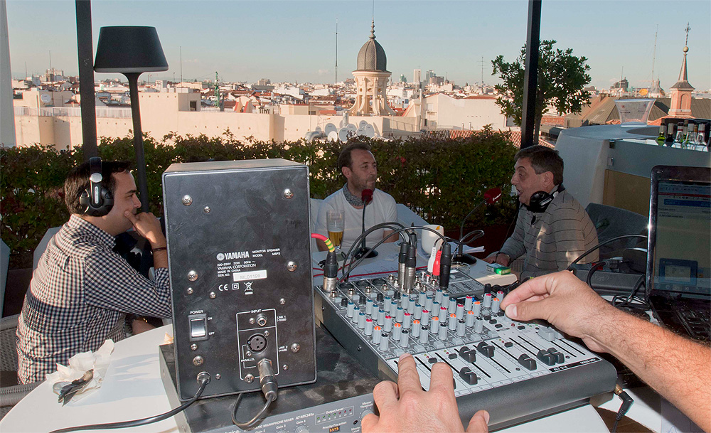 Magníficas vistas desde la azotea del hotel Ada Palas, en pleno centro de Madrid. Andrés Arconada conversa con Antonio Molero, mientras Sergio Pérez, productor del programa, escucha con atención.