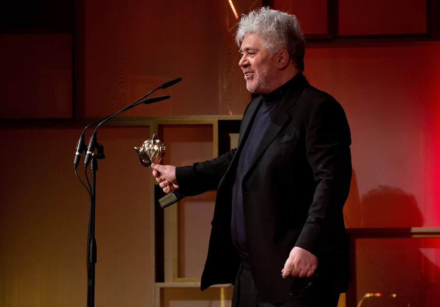 Pedro Almodóvar sí estuvo en la gala de los Feroz, y de hechos se quitó las gafas de sol para recibir el premio al mejor teaser tráiler, el de Los amantes pasajeros, que tuvo que compartir ex aequo con los autores del de 3 bodas de más.