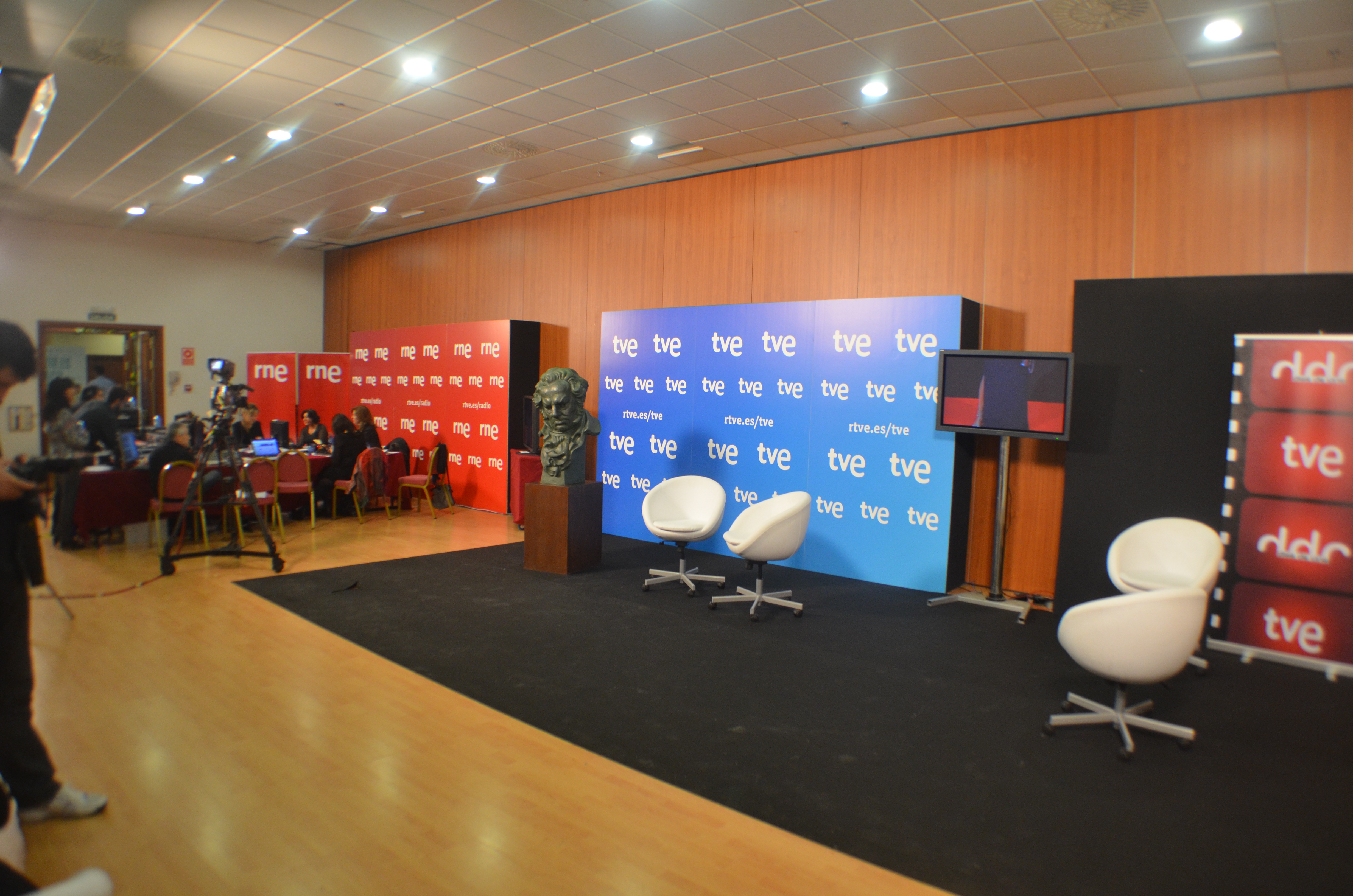 RTVE ha hecho un gran despliegue. En la imagen, de izquierda a derecha, RNE, TVE, Días de Cine y falta el set de Corazón, corazón.