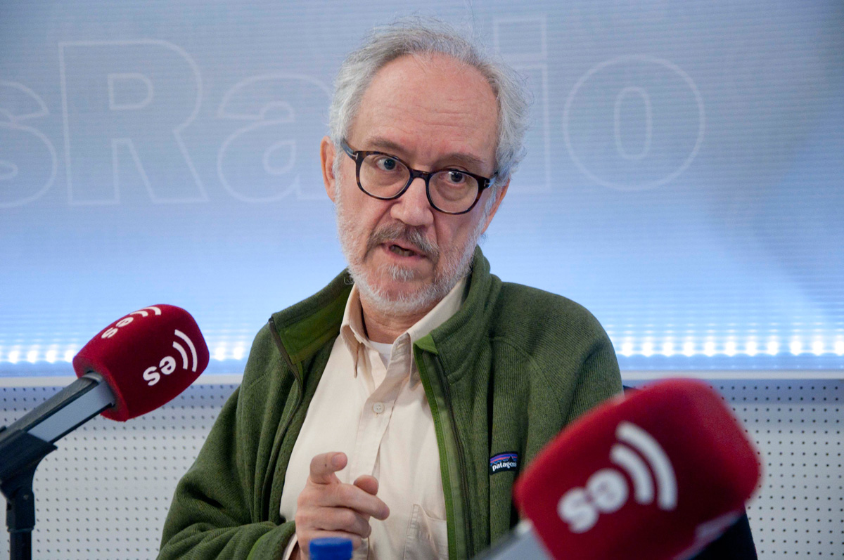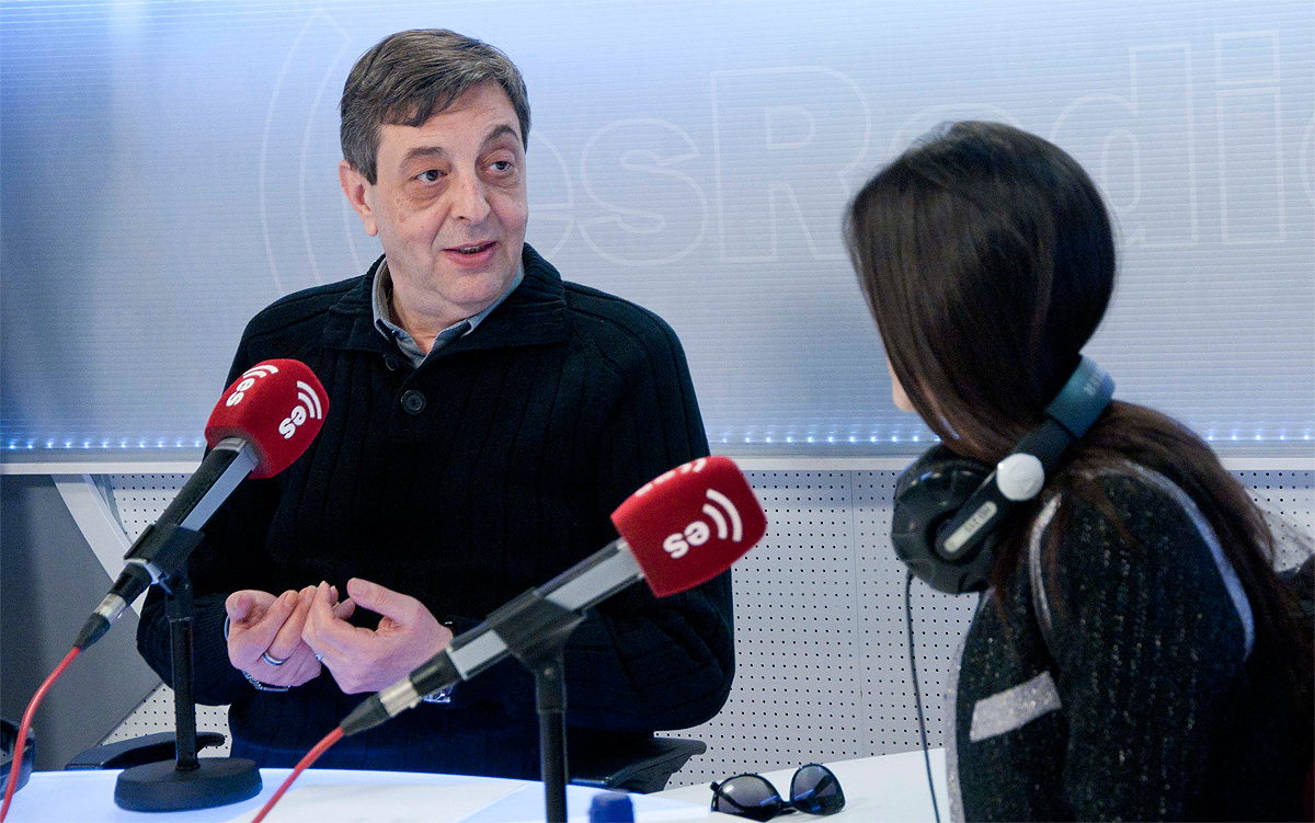 Andrés Arconada, gesticula al preguntar a Clara Lago en el programa Es Cine.