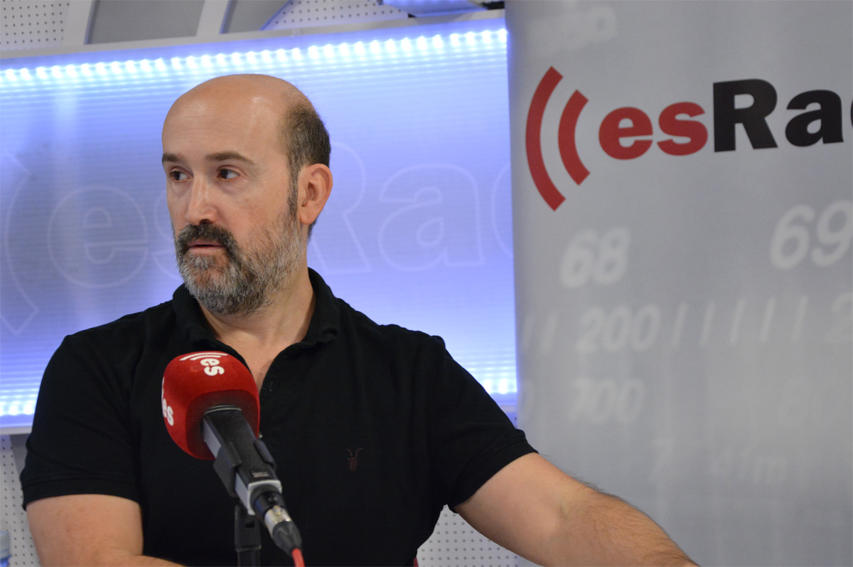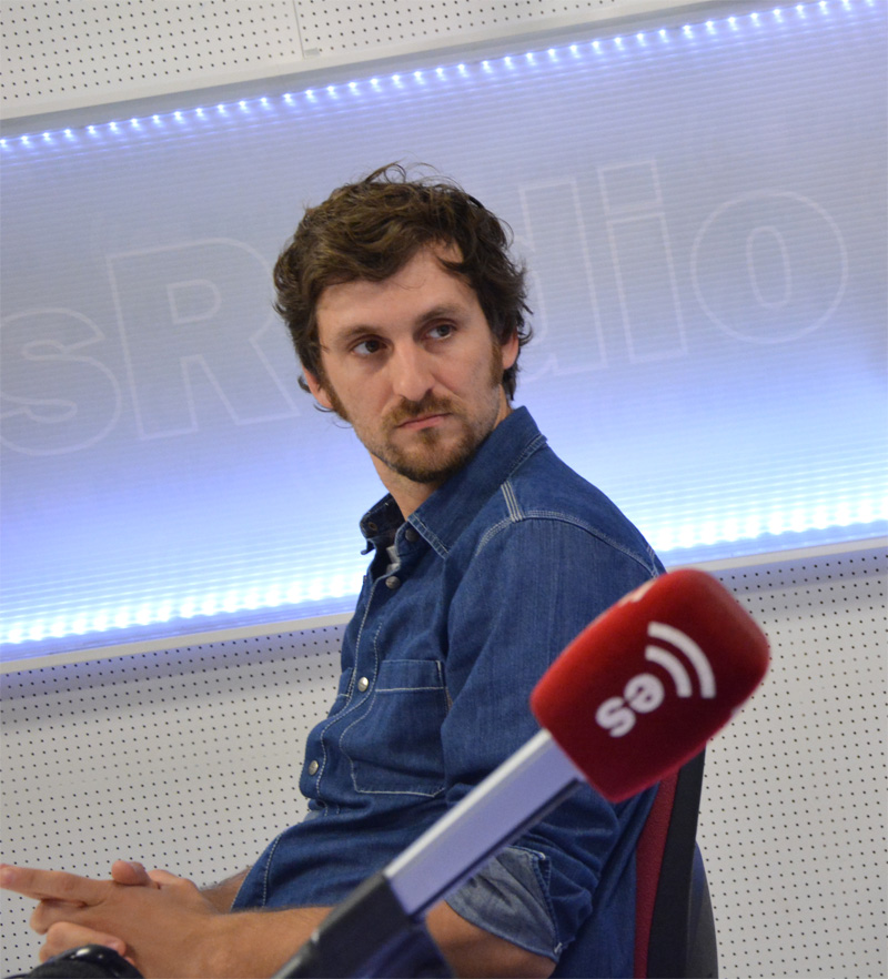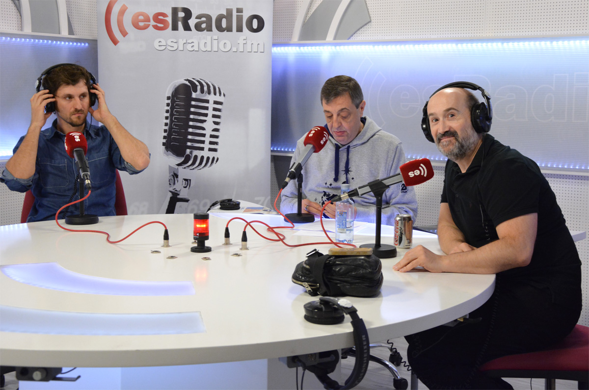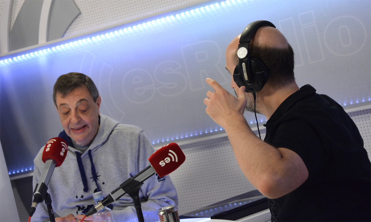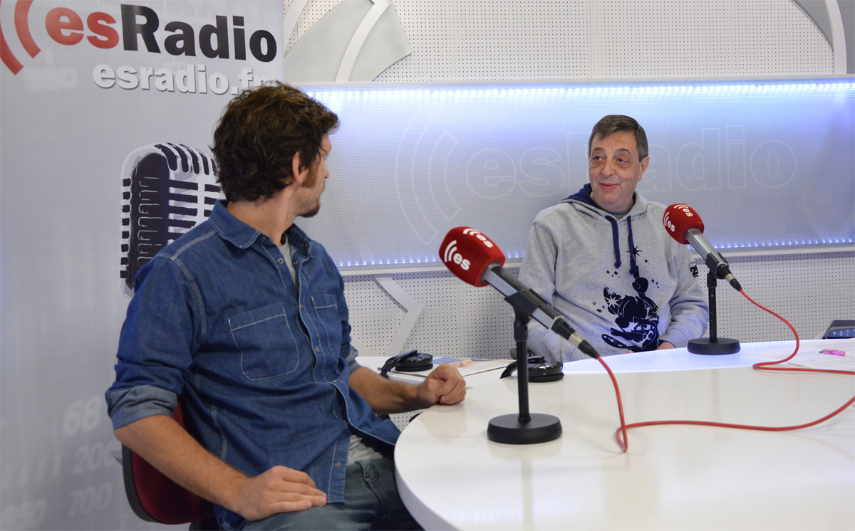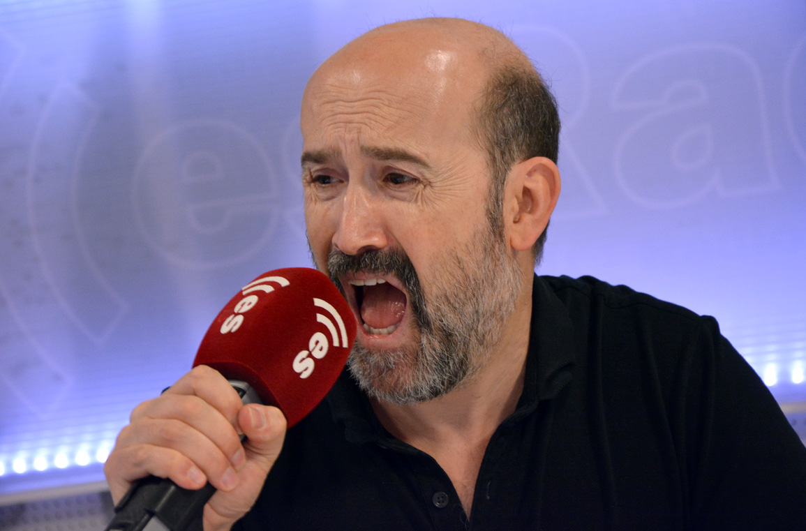Javier Cámara posando de una forma diferente, cogiendo el micrófono de esRadio.