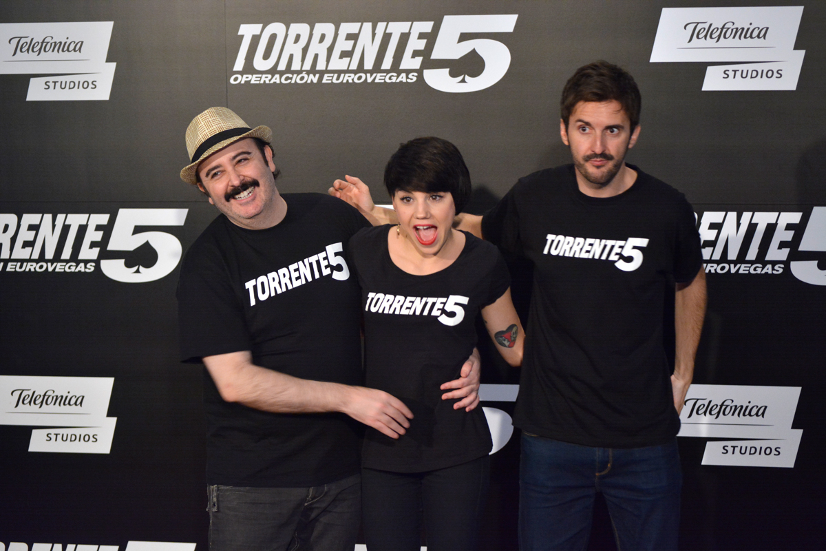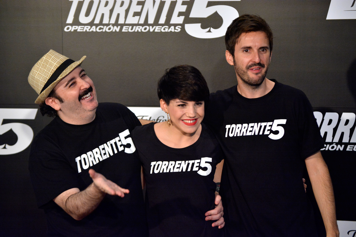 Carlos Areces, Angy y Julián López posando en el photocall de Torrente 5.