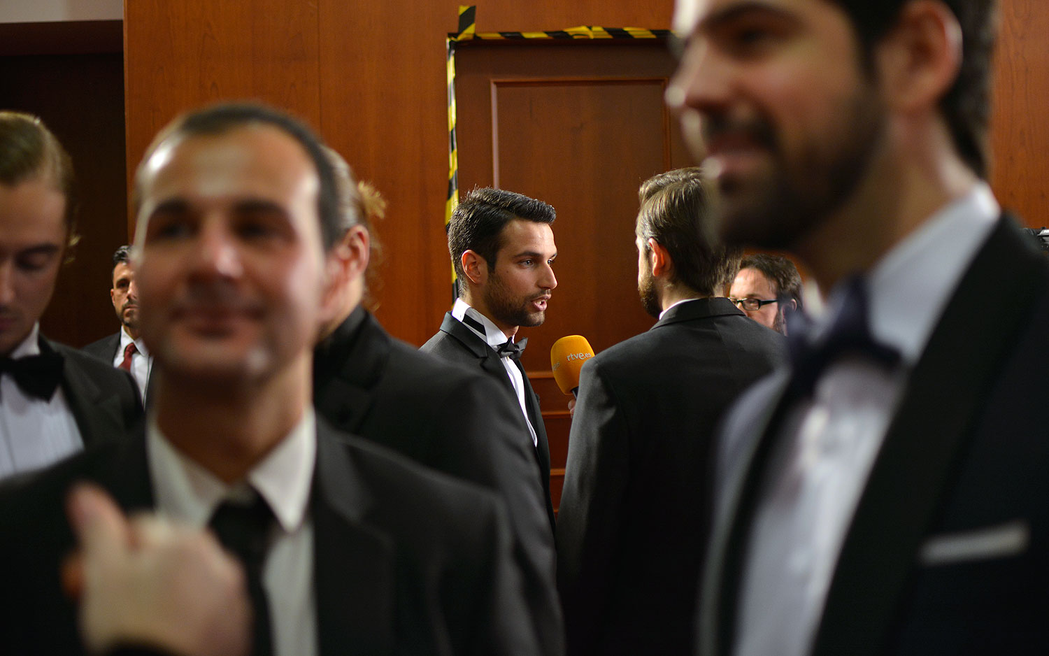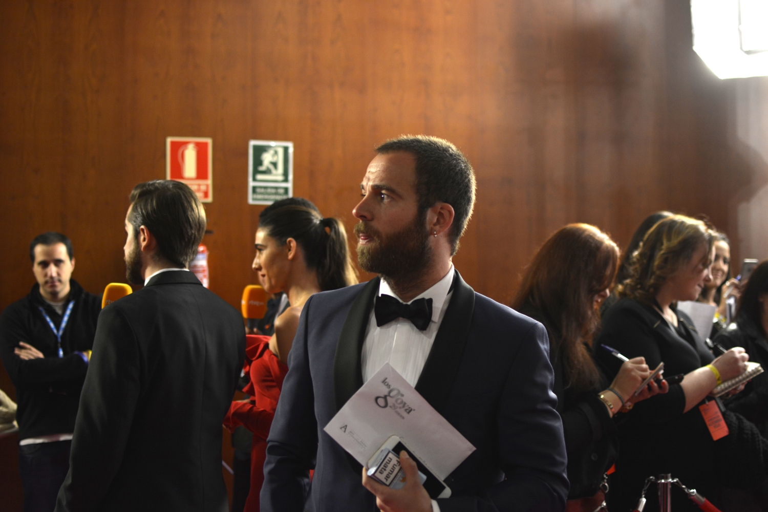 El modelo español Andrés Velencoso, esperando en la zona posterior a la alfombra roja y justo antes de la puerta de entrada al auditorio de la Gala de los Premios Goya.