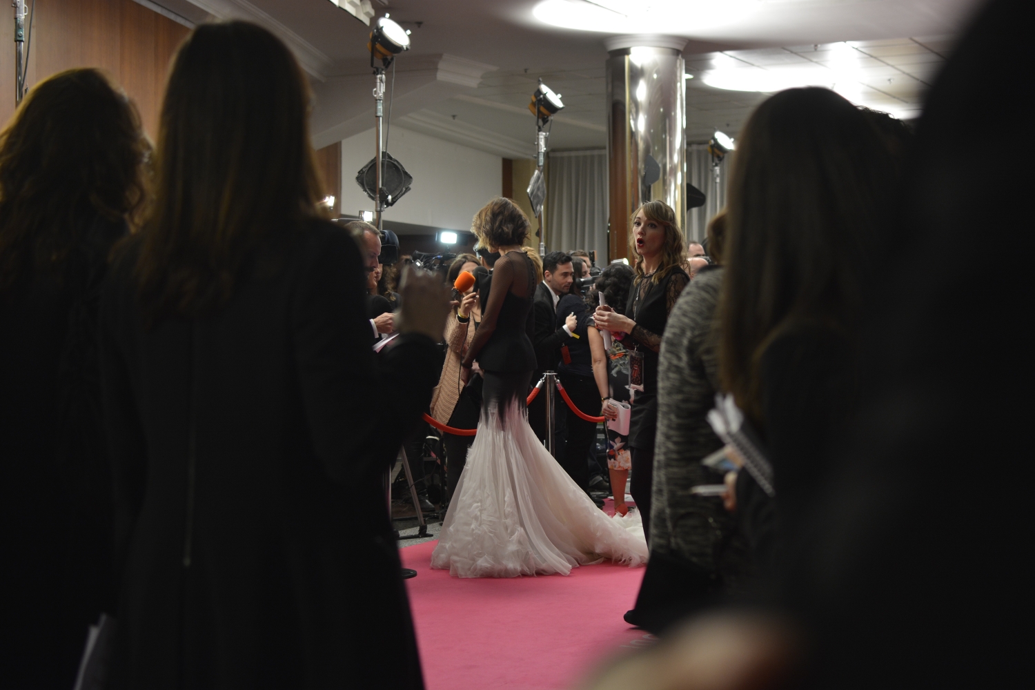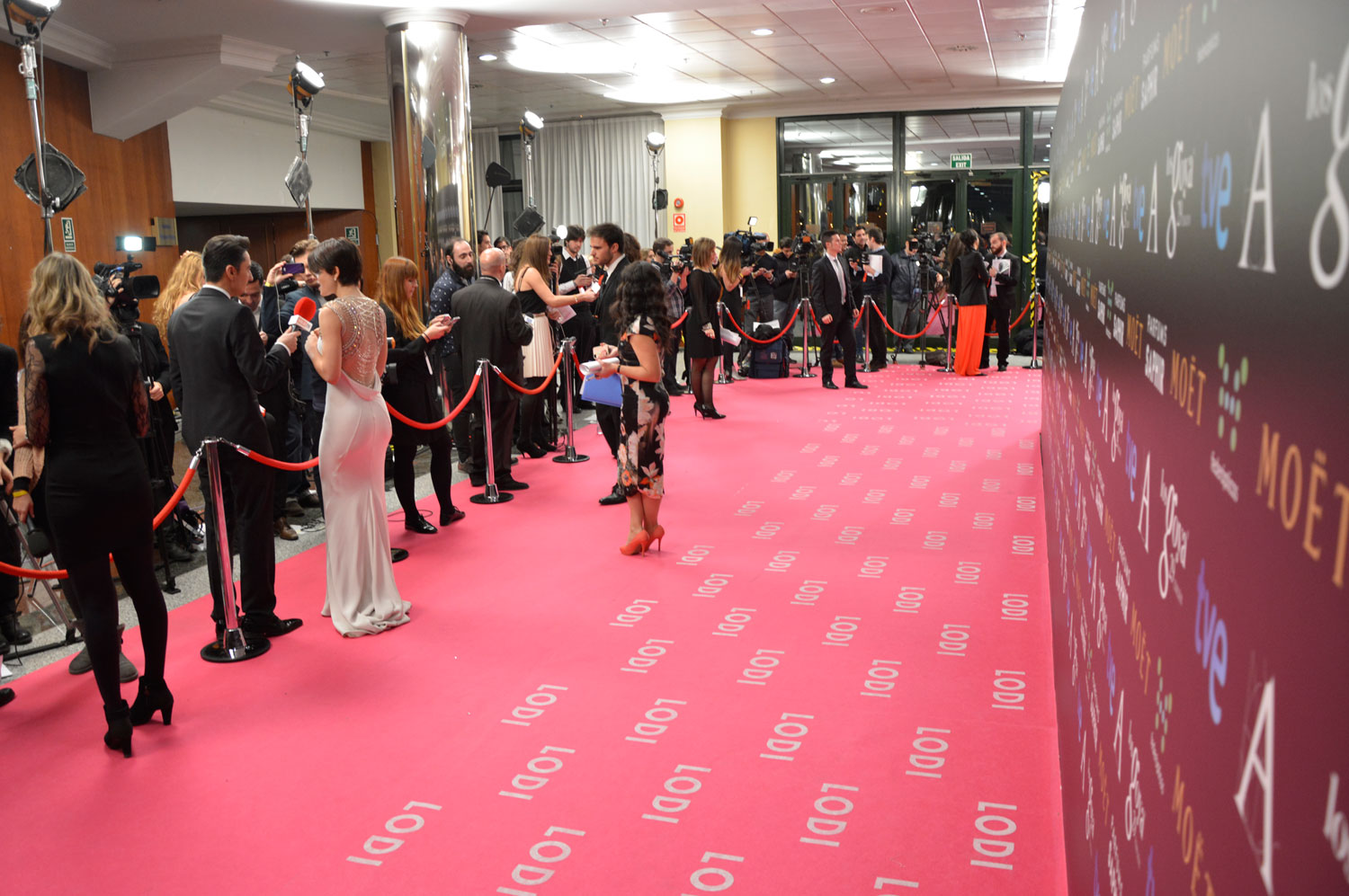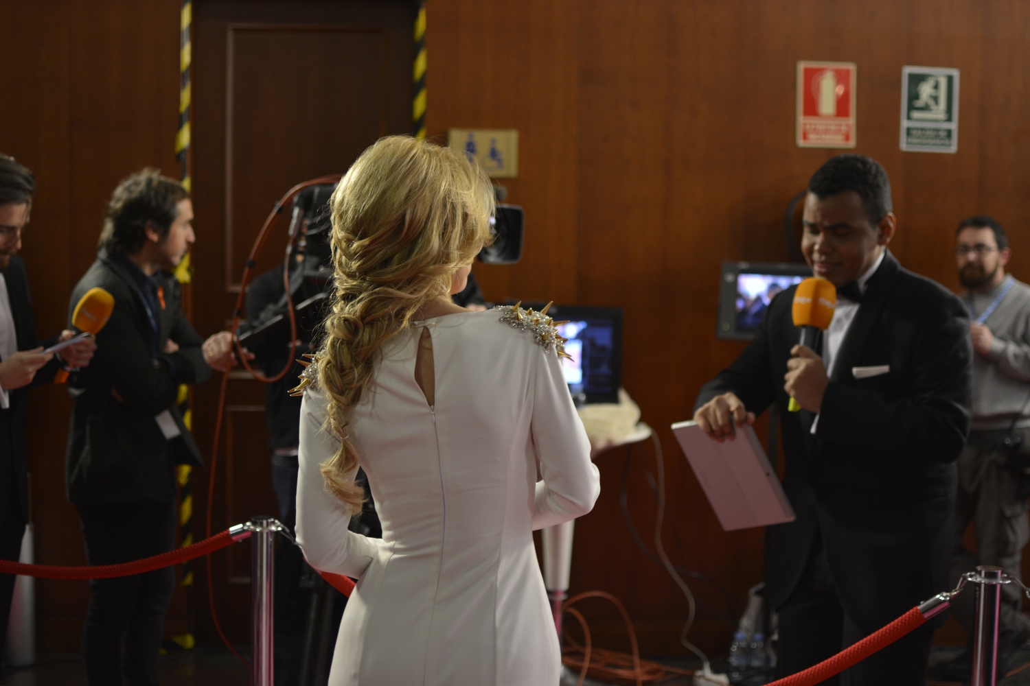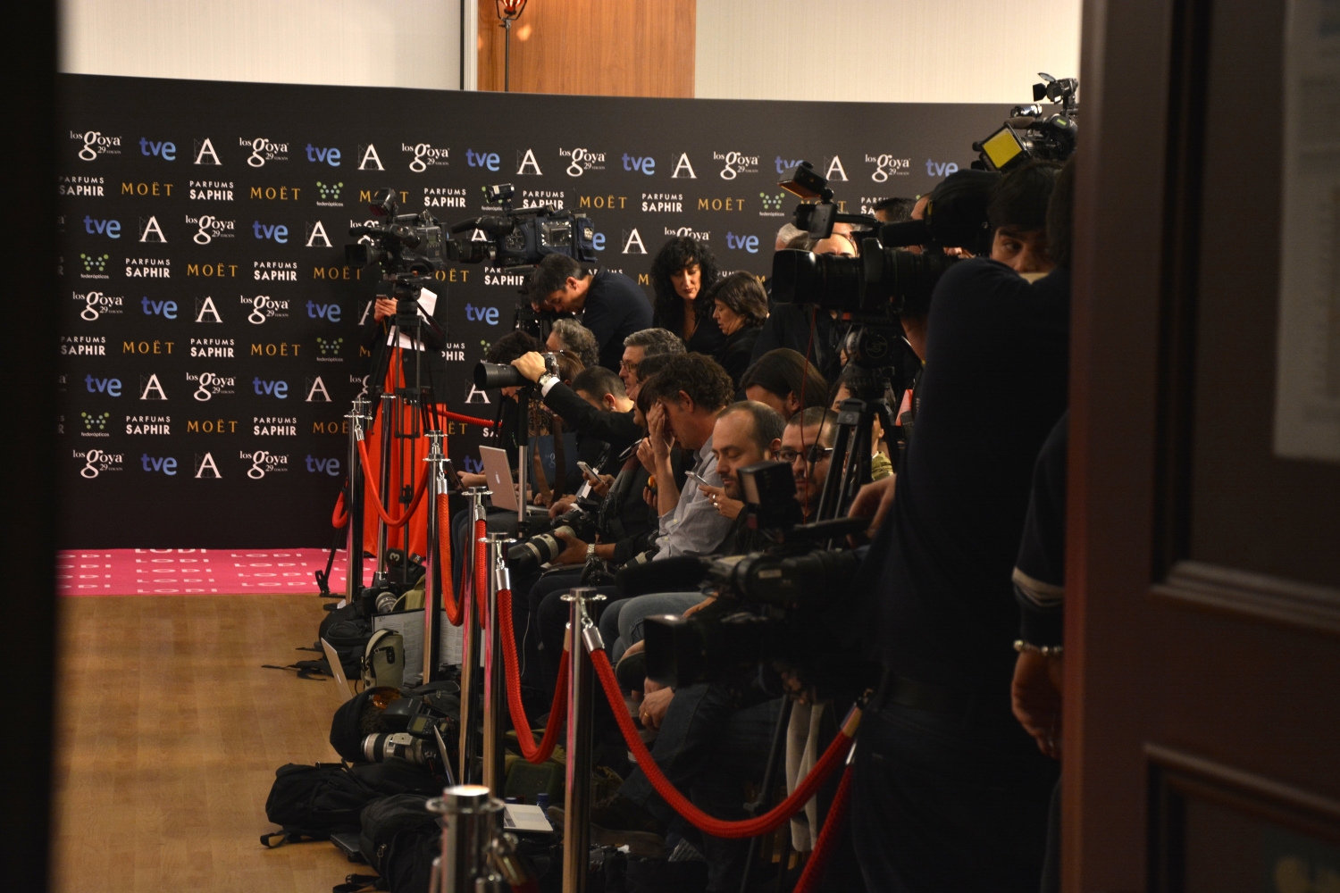 Uno de los photocalls para los invitados. Bárbara Lennie, de blanco es entrevistada unas horas antes de recibir el Goya a mejor actriz por 'Magical Girl'.