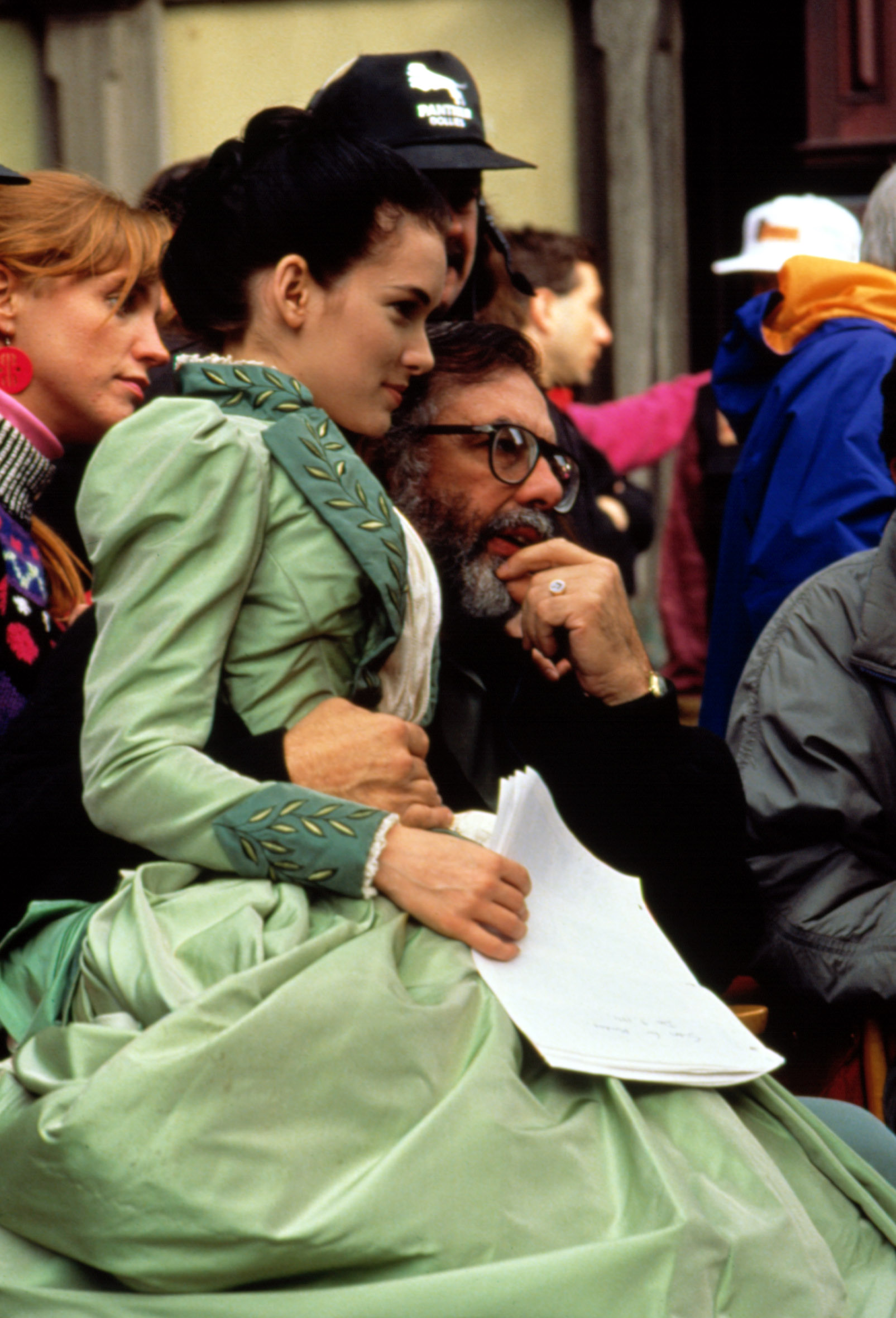 Winona Ryder disfruta de un descanso del rodaje de Drácula (1992), sentada sobre el director de la cinta, Francis Ford Coppola.