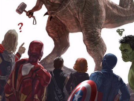 En la imagen, Chris Pratt monta al T-Rex ante la atenta mirada de los Vengadores. Lo más curioso es que el martillo de Thor, que solo puede alzar los que sean dignos de él, está en manos del dinosaurio.
