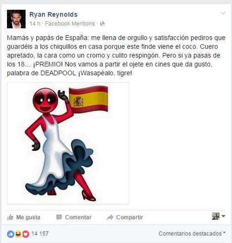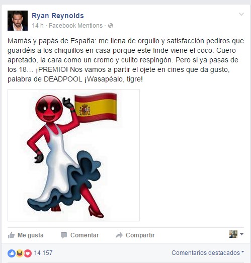 Me llena de orgullo y satisfacción que DEADPOOL ya esté en cines en España. Vamos a partirnos el ojete que da gusto. pic.twitter.com/6JPfWZcy0e