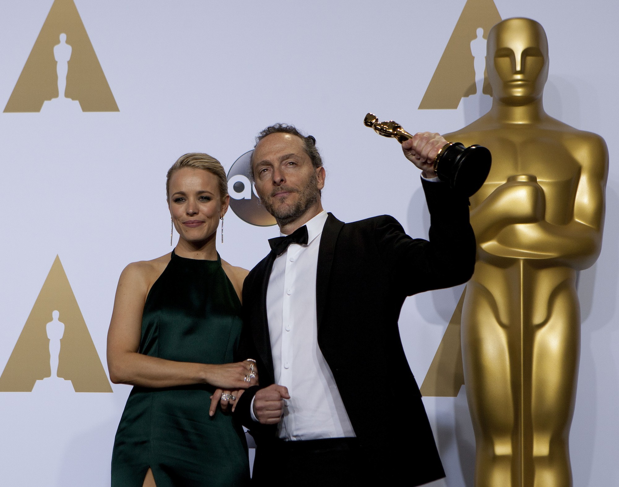 La actriz Rachel McAdams acompaña al director de fotografía Emmanuel Lubezki quien posa con su Oscar a Mejor Fotografía por la película El Renacido.