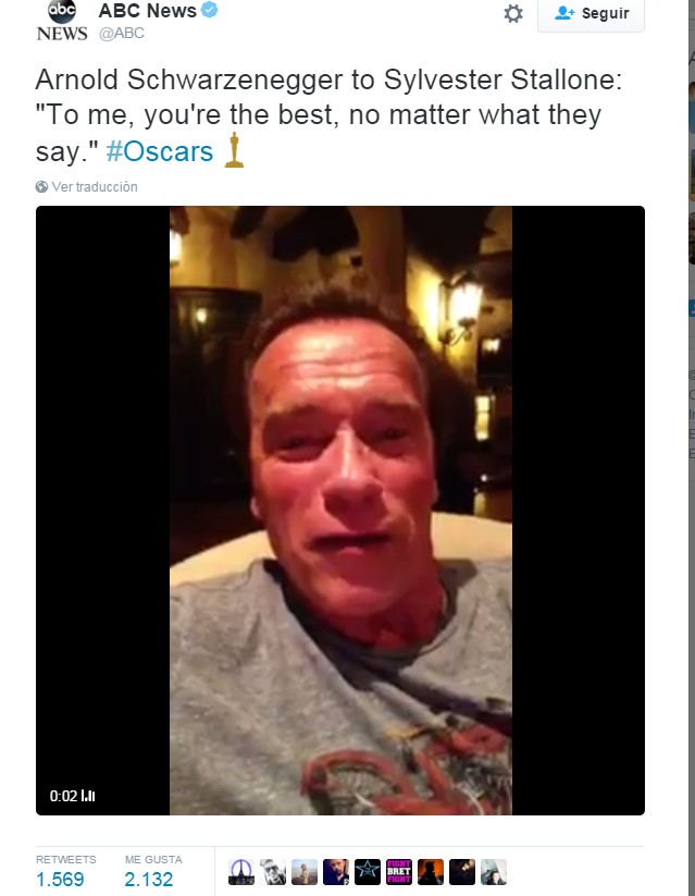 Uno de los giros más inesperados de la noche fue el Oscar a Mark Rylance, que dejó sin premio al favorito Sylvester Stallone. Tan sorprendente fue que su compañero Schwarzenegger se ha solidarizado con él vía redes sociales con un mensaje de ánimo a su viejo amigo y competidor. Twitter