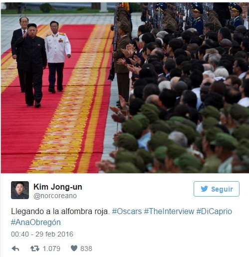 No todos los memes de la noche fueron del oso de El Renacido. En España, norcoreano logró apuntarse otro éxito con esta falsa imagen de la alfombra roja.