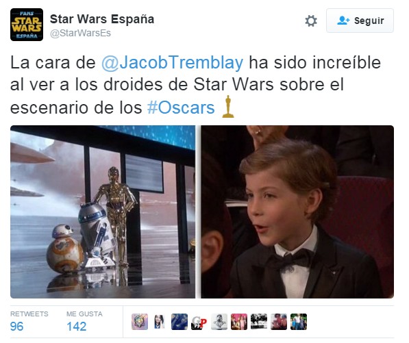 Los simpáticos droides de Star Wars, BB-8, C3PO y R2D2 salieron al escenario e hicieron las delicias de los más pequeños, Incluyendo al protagonista de La habitación, Jacob Tremblay, que se puso en pie visiblemente entusiasmado.