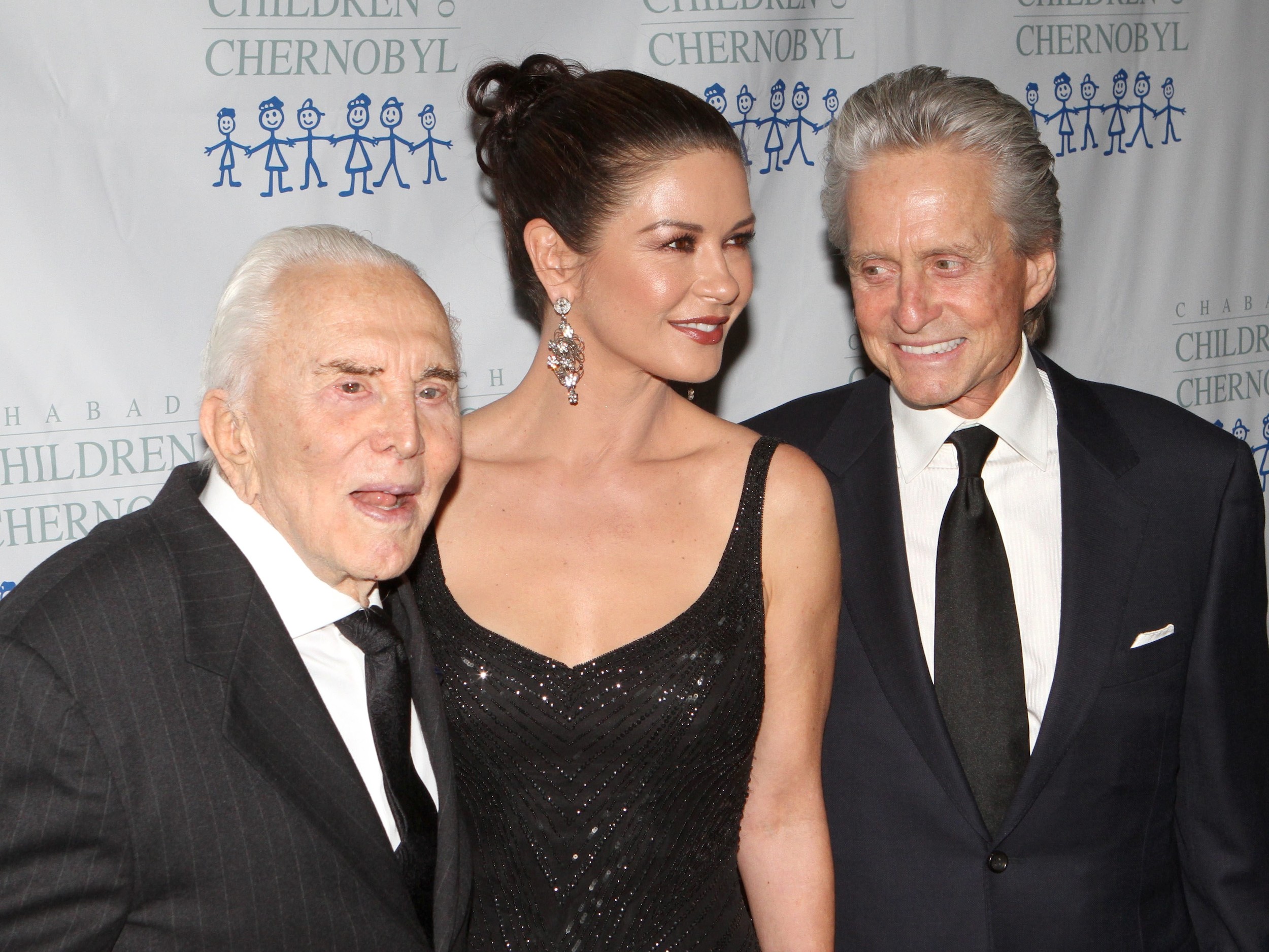 Kirk Douglas, durante una de sus últimas apariciones en público, junto a su hijo Michael Douglas y su nuera Catherine Zeta-Jones.