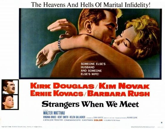 Pero donde está inconmensurable y sublime es en Un extraño en mi vida (1960), donde unos personajes de clase media alta se deslizan a través de vidas aparentemente perfectas aunque bajo ellos bullen pasiones ardientes como la lava. Douglas es un arquitecto un tanto alienado por una vida pequeño burguesa que choca con sus ambiciones de ser un nuevo Le Corbusier. Pero entonces se cruza en su vida una Helena de Troya algo aburrida en la piel, ¡y qué piel!, de Kim Novak con la que mantienela enésima tópica relación adúltera. Sin embargo, nos enteramos de cómo se afeita el hoyuelo de la barbilla y cómo un "no" puede significar un "sí, por favor, rápido".