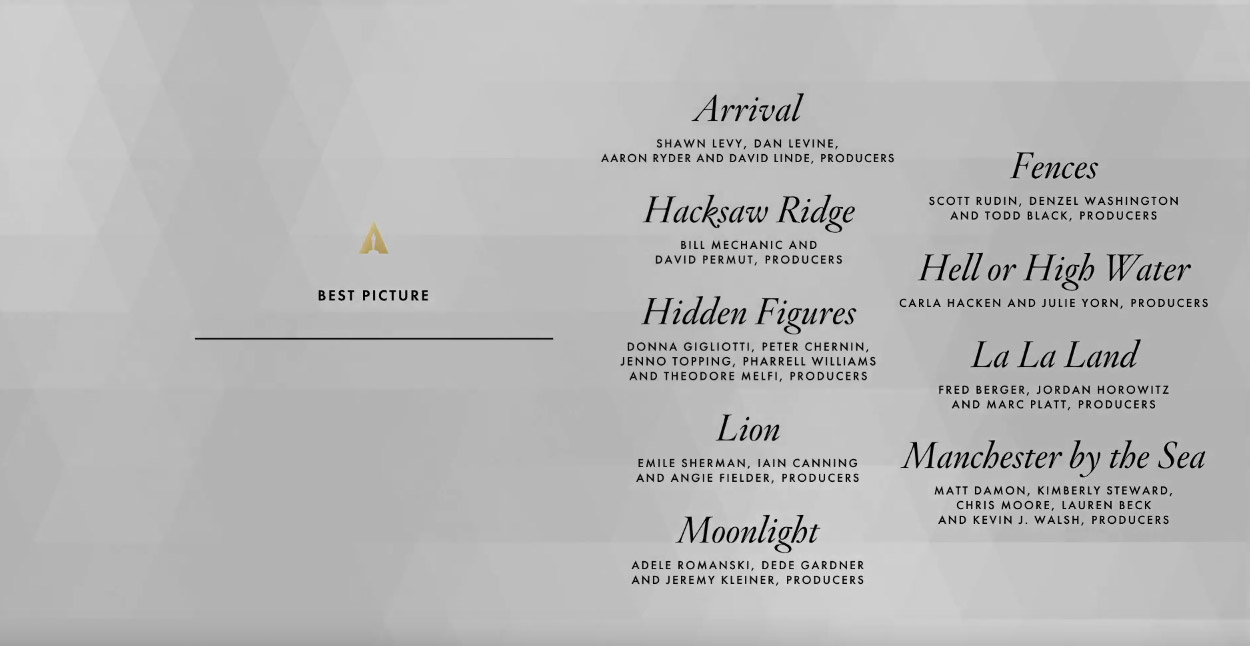 Mejor guión adaptado: Arrival, Fences, Figuras ocultas, Lion, Moonlight.